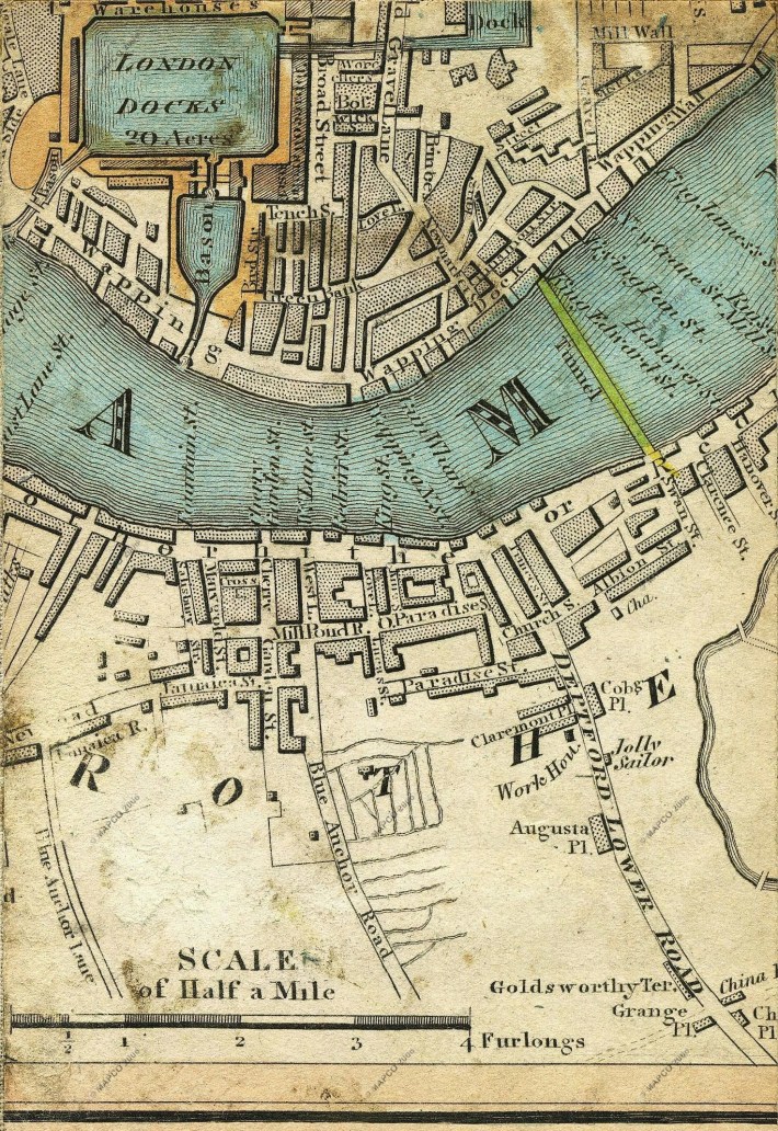 On Wednesday I reported on the story of Alexander Morrison the Younger (1761-1816?) who was a ship chandler and coal merchant in Wapping (now Wapping High Road). The story goes that his Wapping premises was demolished to make an entrance during construction of the London Docks (1799-1815), and that he moved to Jane Street off Commercial Road. The original premises were said to be next to Wapping Old Stairs and the Town of Ramsgate Hotel. Indeed that is where one finds the old entrance to the docks (now also filled in).