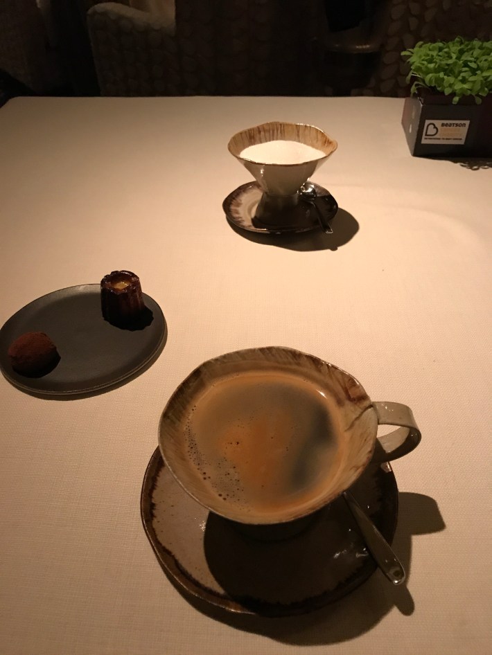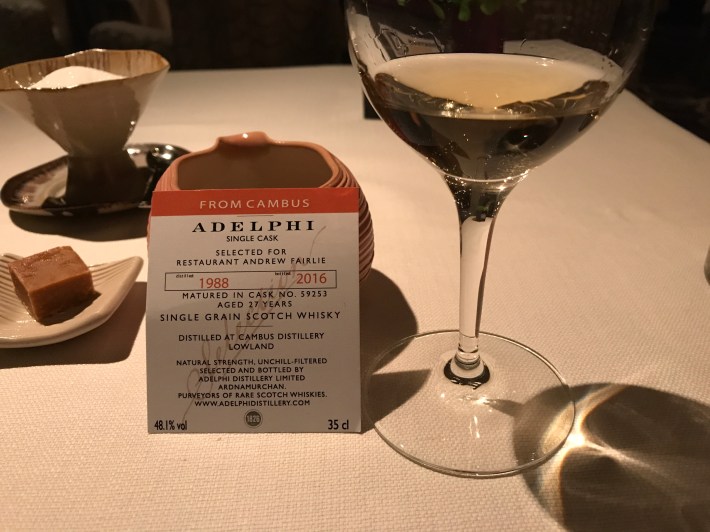 I was pleased to secure a place at the table of this premier Scottish chef. I opted for the degustation menu with wines chosen to compliment each of the seven courses. Each dish was presented and described by my waiter and every wine likewise. Some canopies came forth to accompany an aperitif.