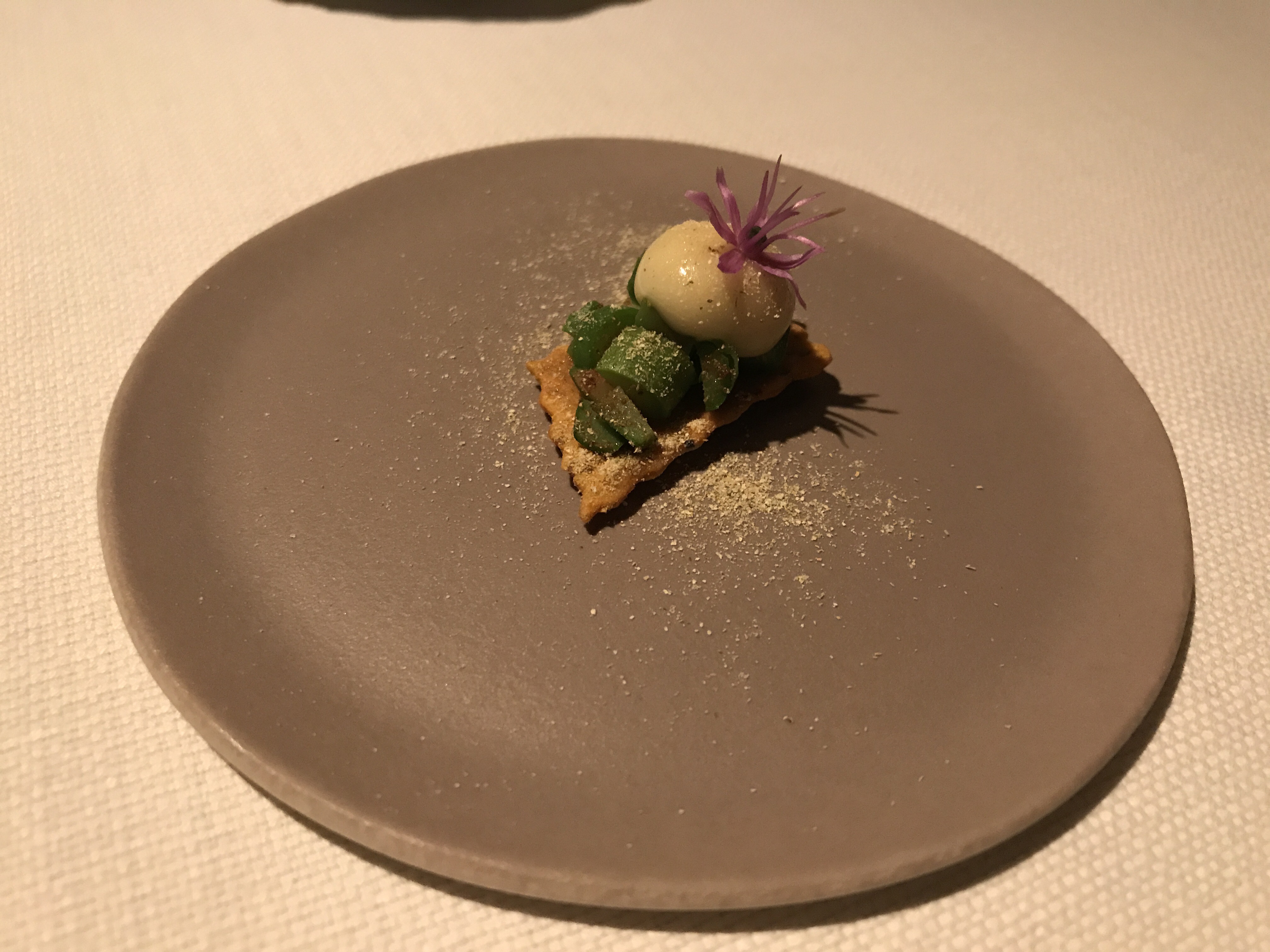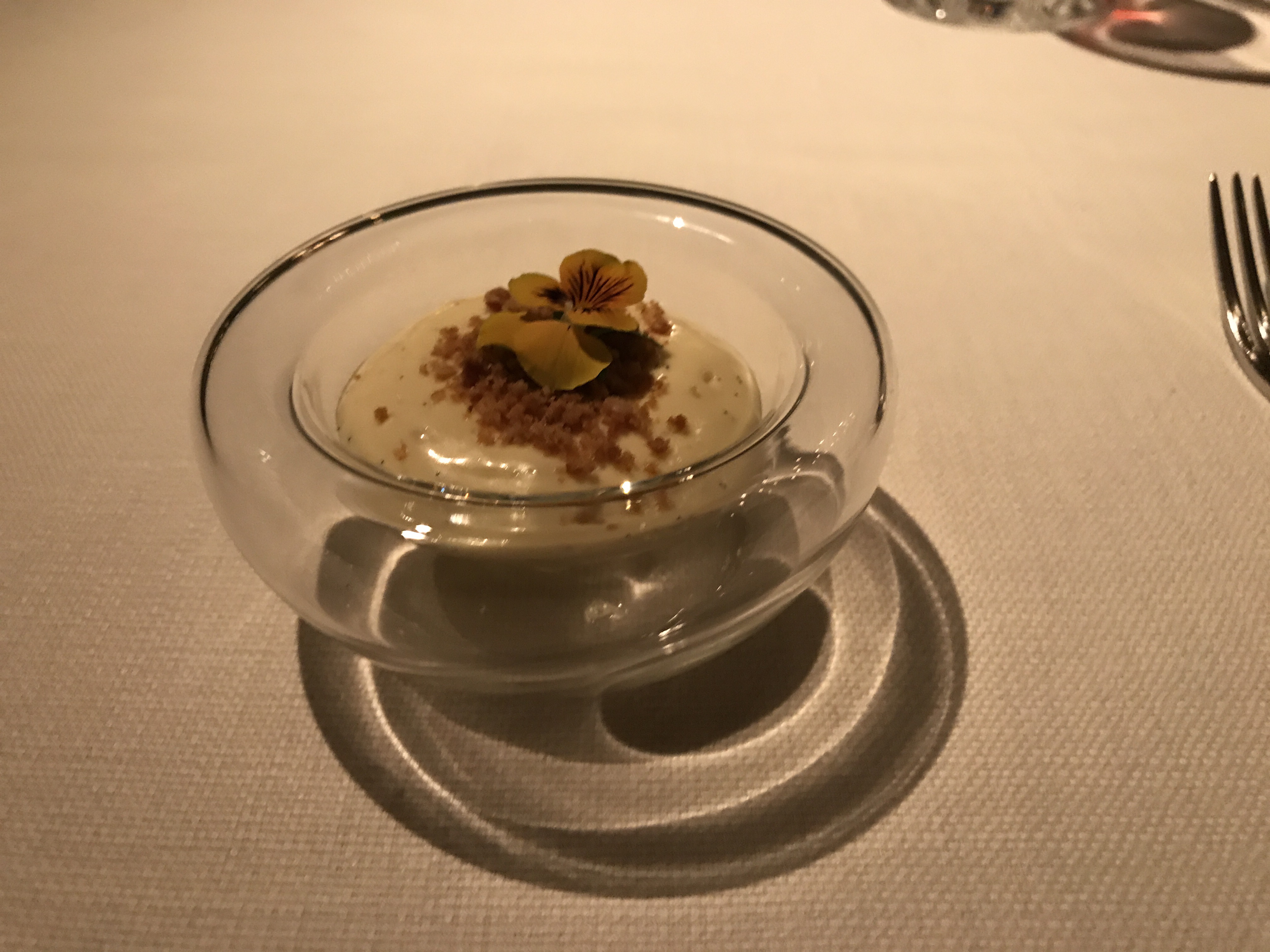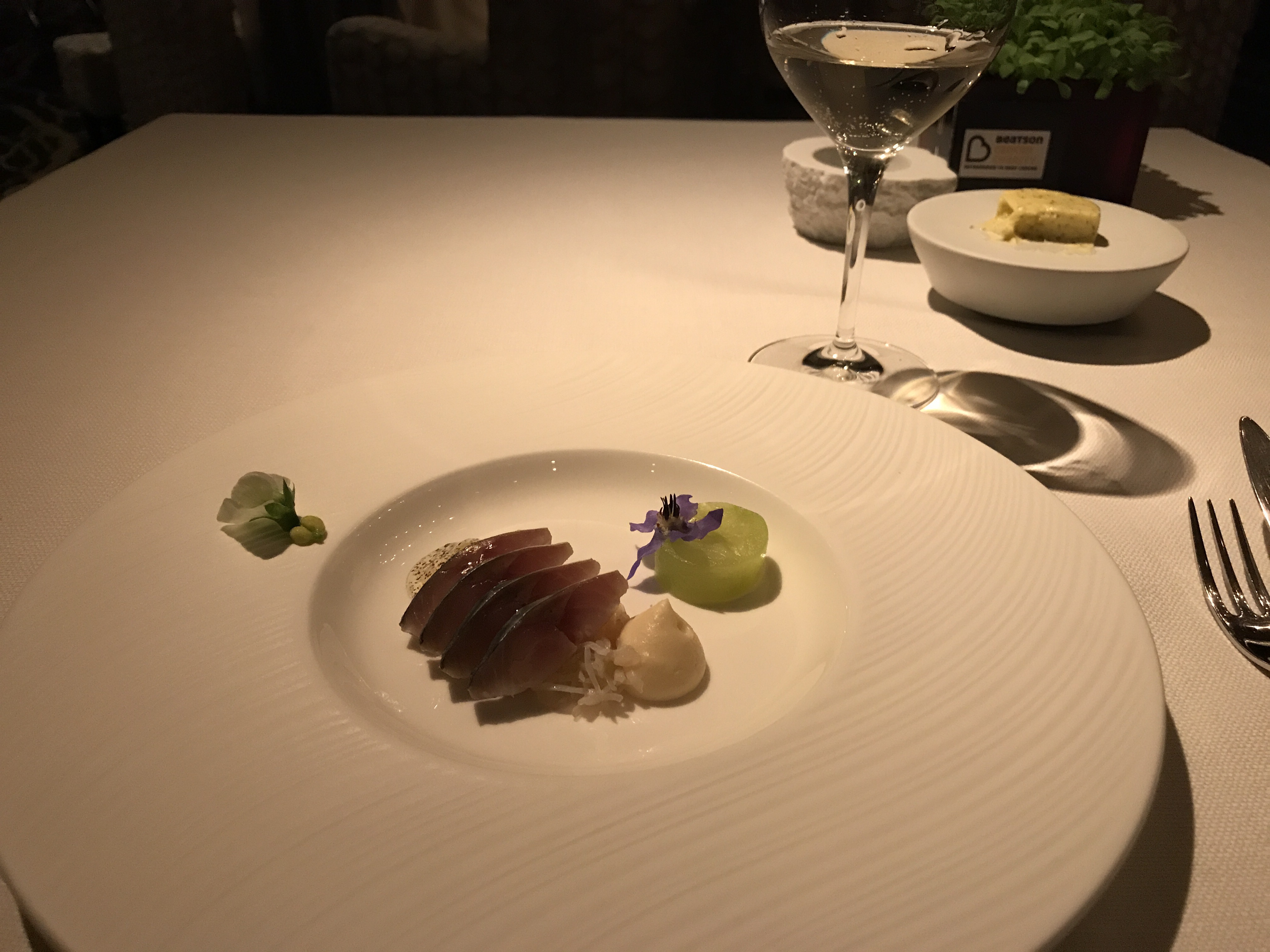 I was pleased to secure a place at the table of this premier Scottish chef. I opted for the degustation menu with wines chosen to compliment each of the seven courses. Each dish was presented and described by my waiter and every wine likewise. Some canopies came forth to accompany an aperitif.