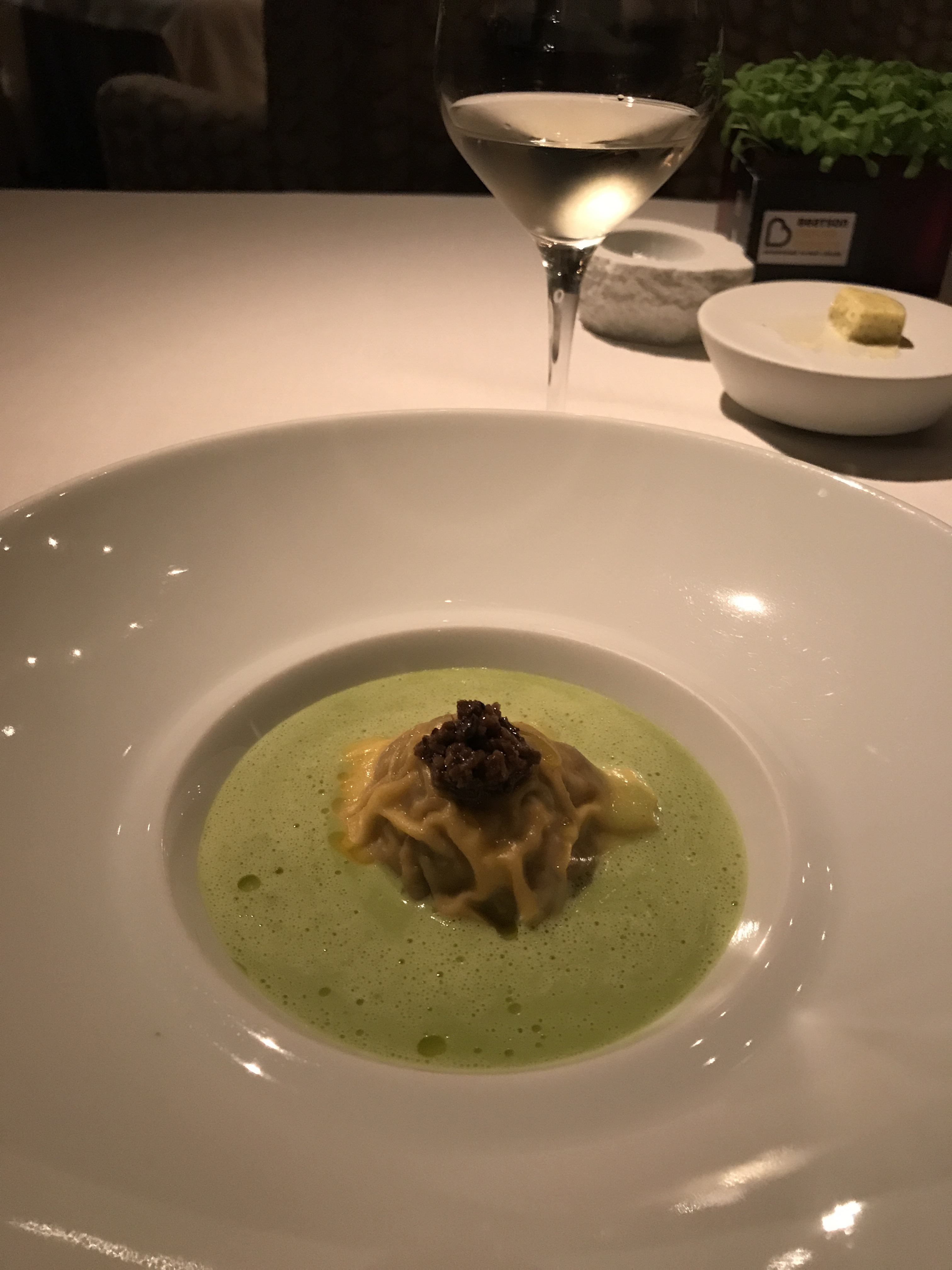 Wild mushroom ravioli, asparagus velouté and truffle.