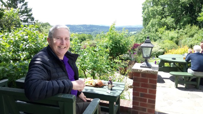 A seriously beautiful Worcestershire town. And a hilly one – glad I have one leg longer than the other. We journied to The Chase Inn at nearby Upper Colwall for lunch. Great views over Herefordshire towards the distant hills in Wales. I did my best to make an indent into their Ploughman’s lunch.