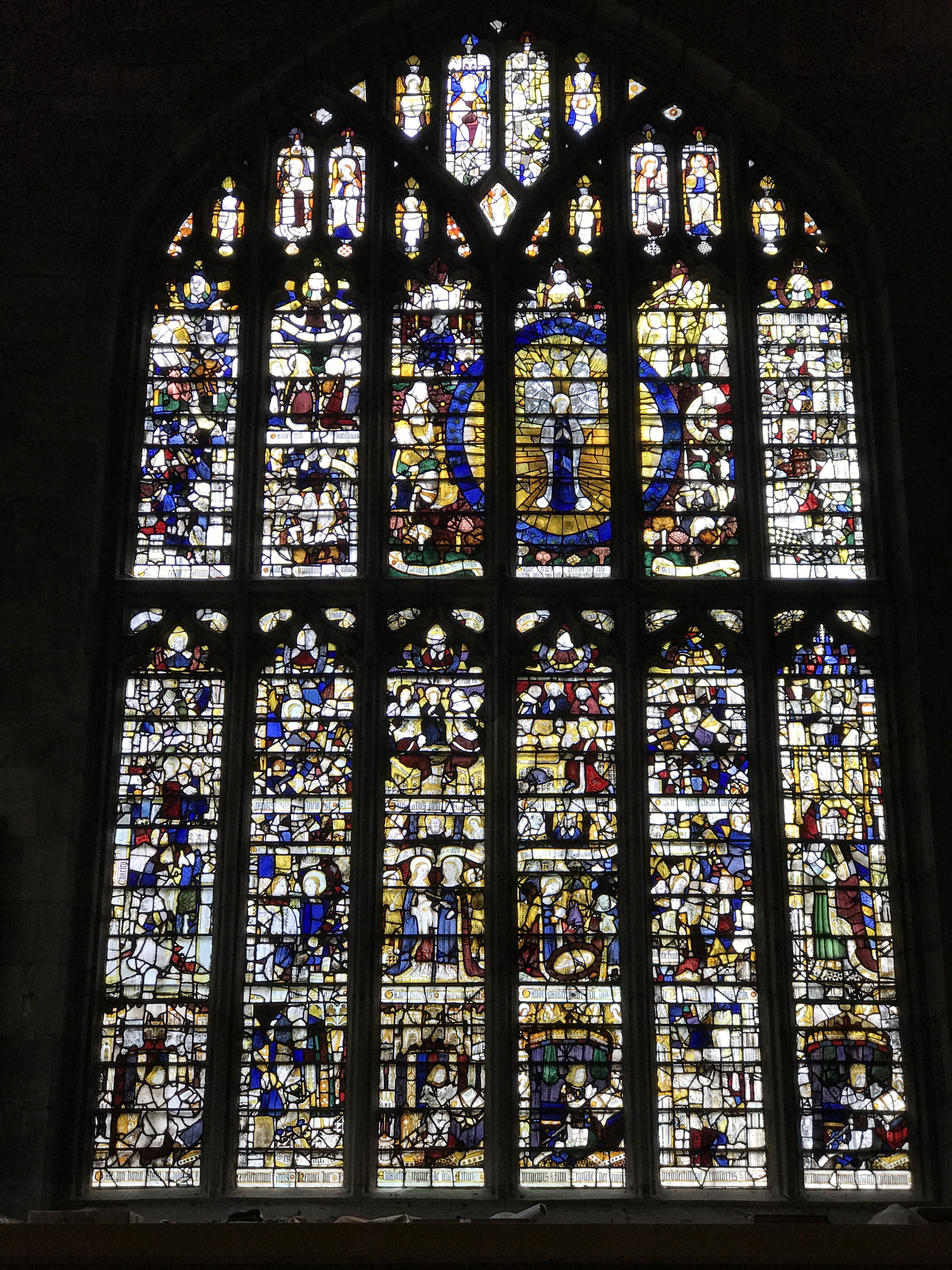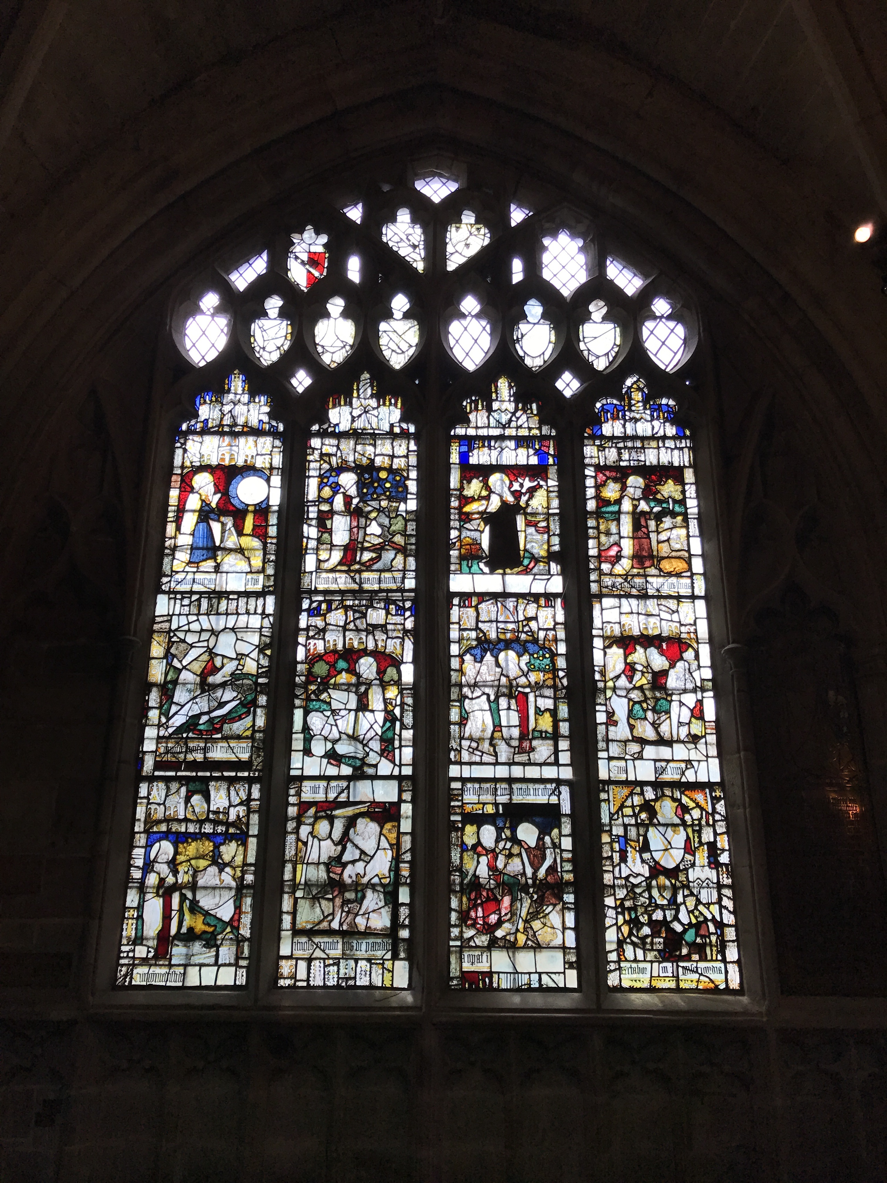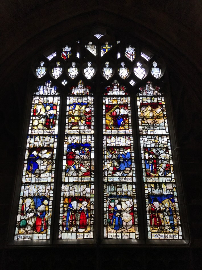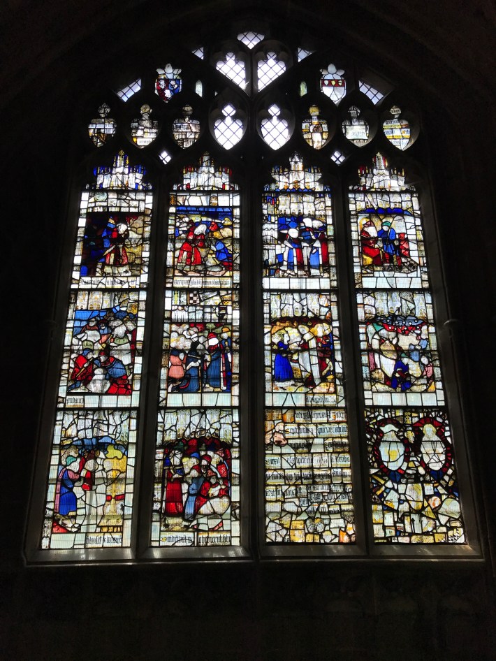 This beautiful expanse of glass is known as the Magnificat window. It was given in 1501/2 by King Henry VII and three of his courtiers. Figures of them and Henry’s eldest son, Arthur, appear along the base.The glass tells the story of the Incarnation – God becoming man in the person of Jesus. It is filled with scenes from the life of Jesus as witnessed by his mother Mary.