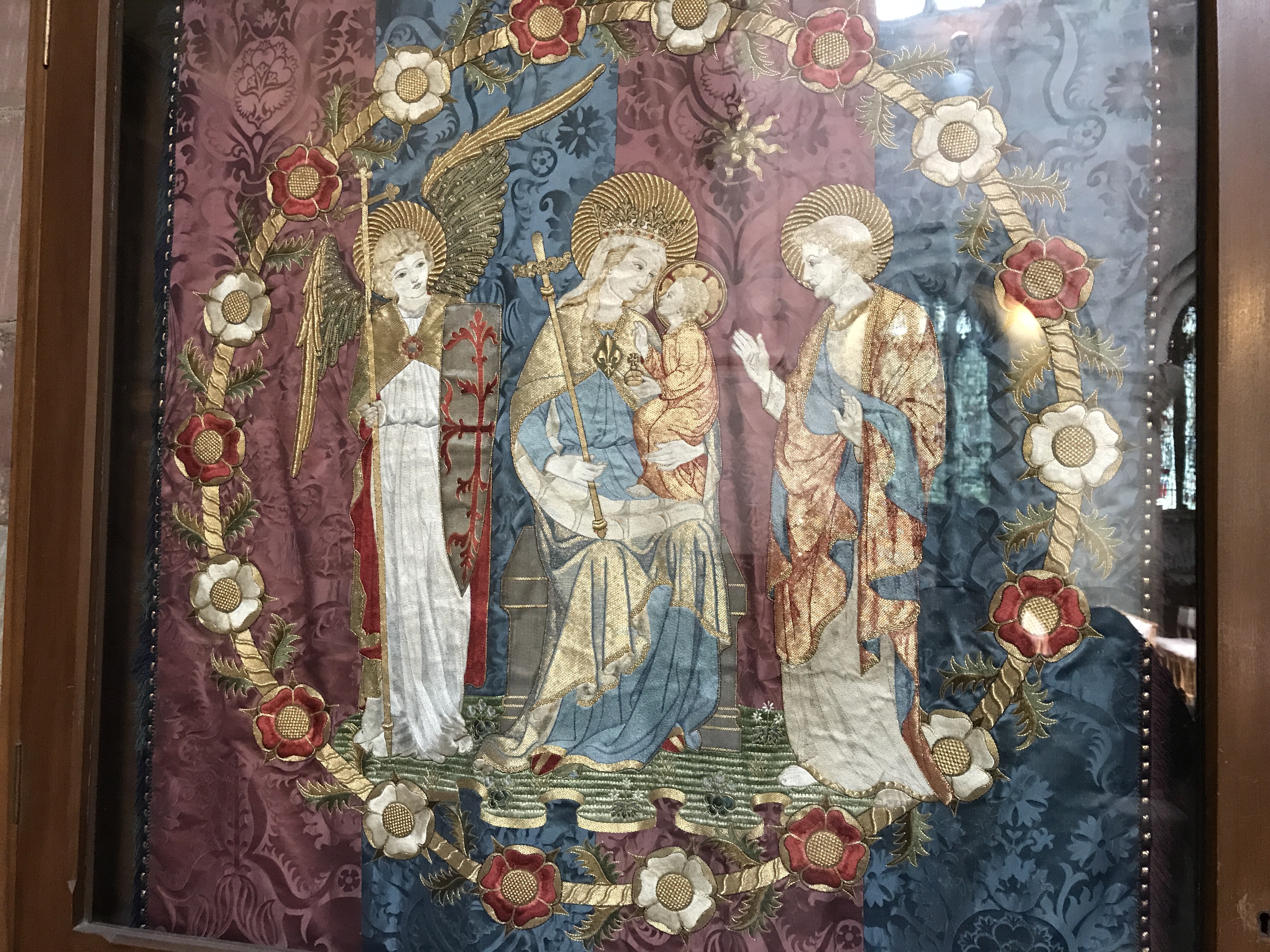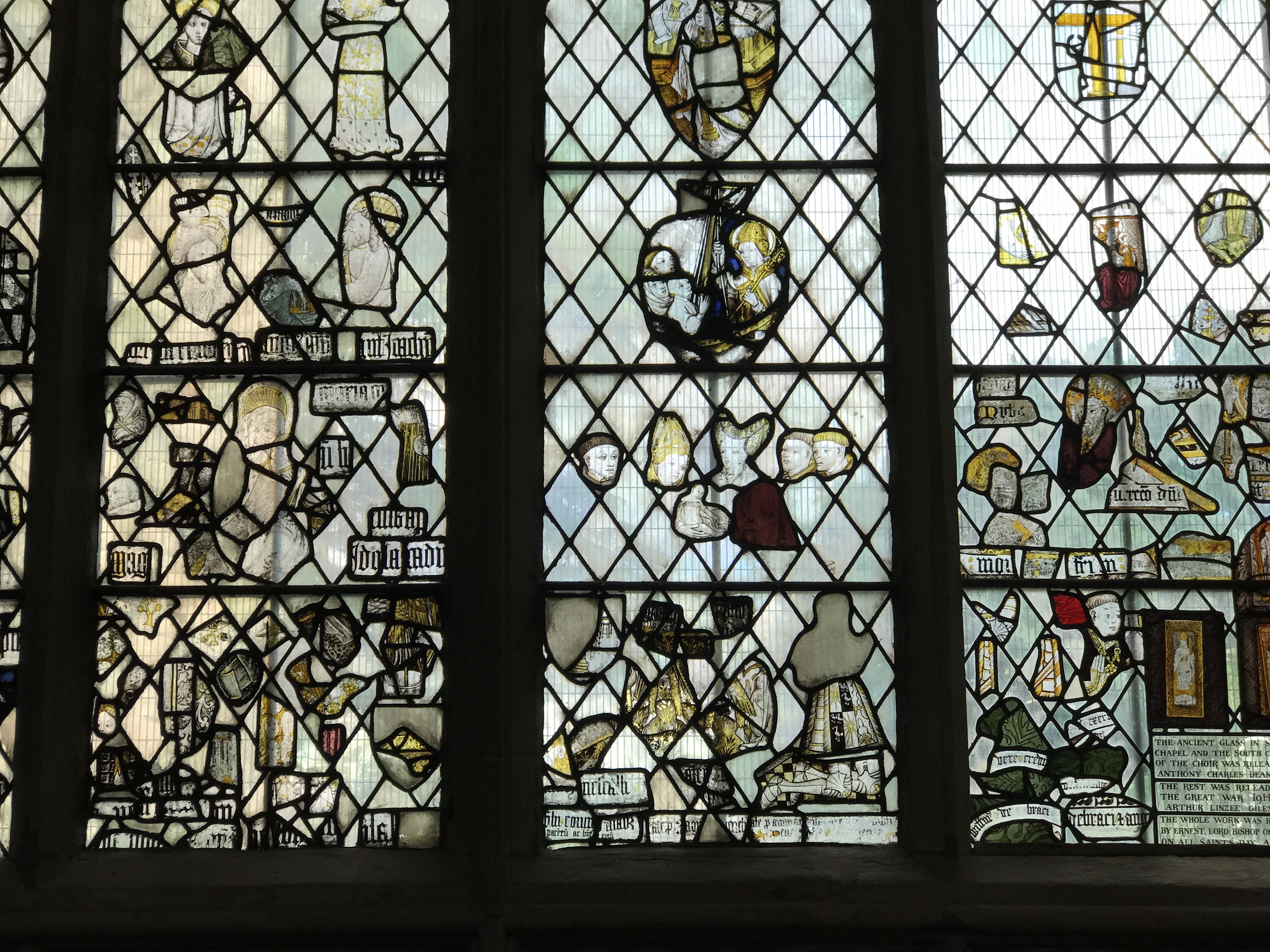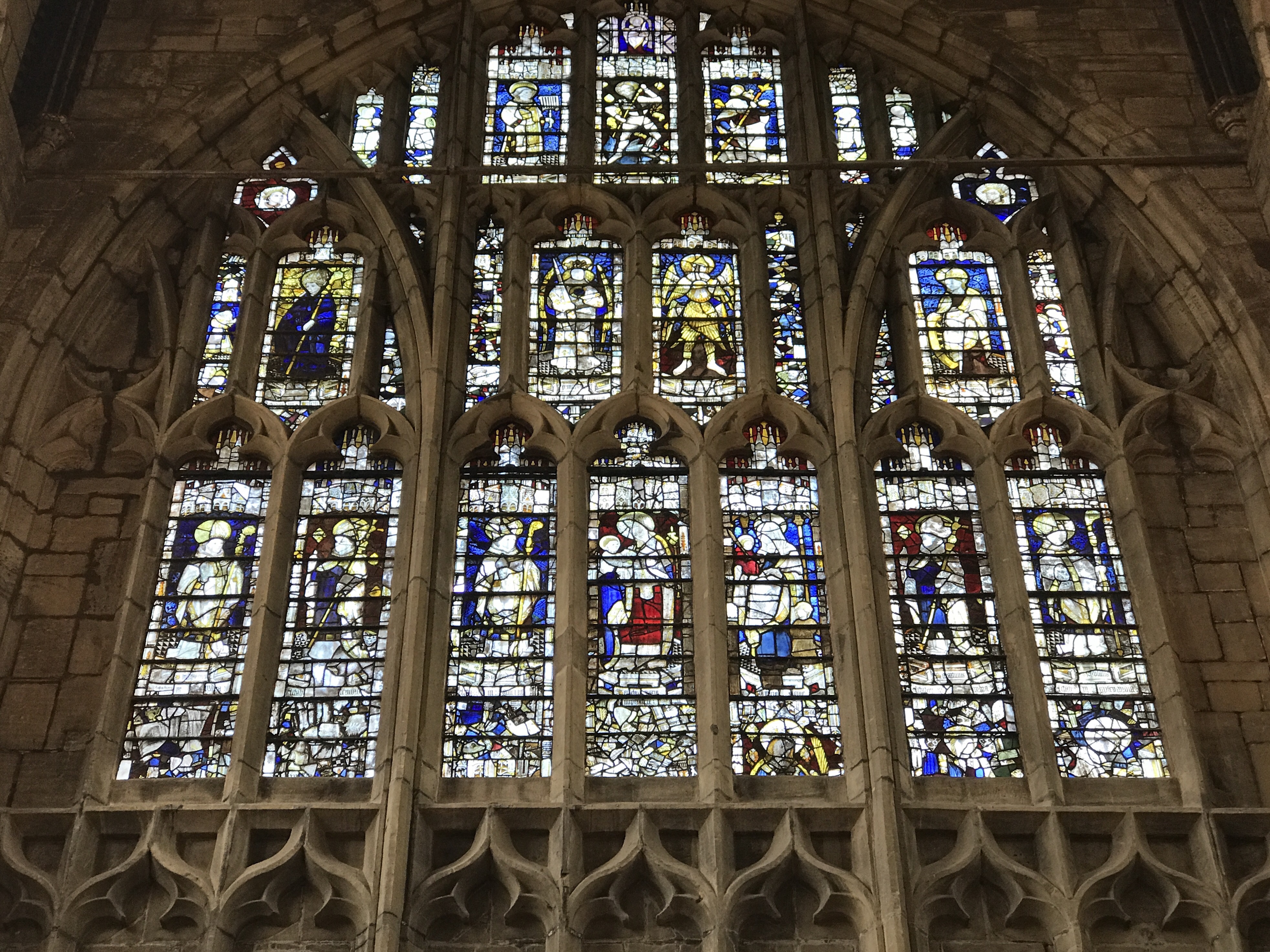 This beautiful expanse of glass is known as the Magnificat window. It was given in 1501/2 by King Henry VII and three of his courtiers. Figures of them and Henry’s eldest son, Arthur, appear along the base.The glass tells the story of the Incarnation – God becoming man in the person of Jesus. It is filled with scenes from the life of Jesus as witnessed by his mother Mary.