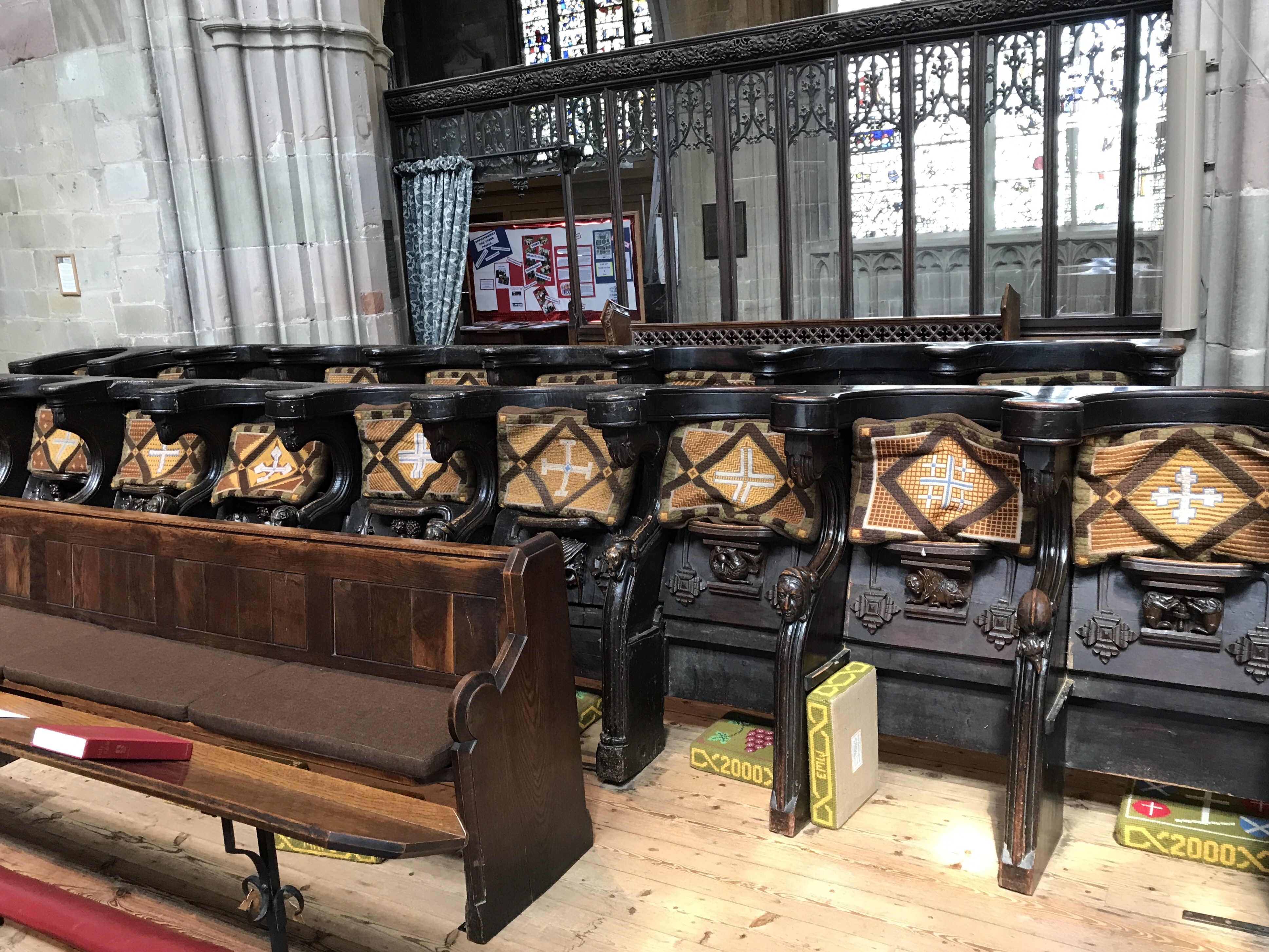 There are two sets. The earlier group includes carvings of mythical creatures and domestic scenes while the second set depicts the months of the year. 22 stalls of the original 24 remain.