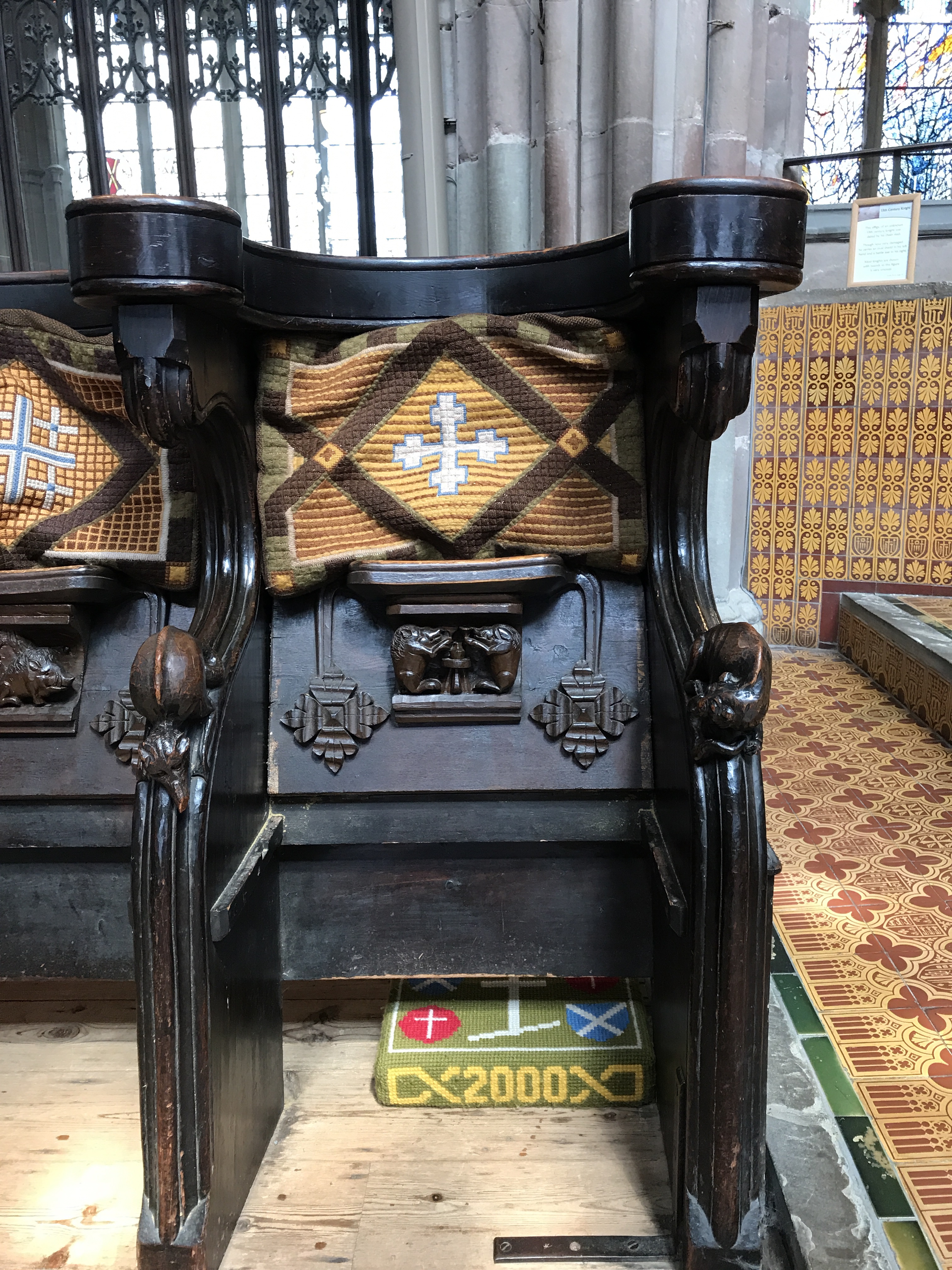 Each side of the chancel is lined with monks’ stalls known as misericords which date from the 14th and 15th centuries. Misericord comes from the Latin word ‘misericordia’ which means mercy. Monks could lean on the ledges of the upturned seats to give them ‘merciful relief’ from the long hours of standing during their eight daily services.