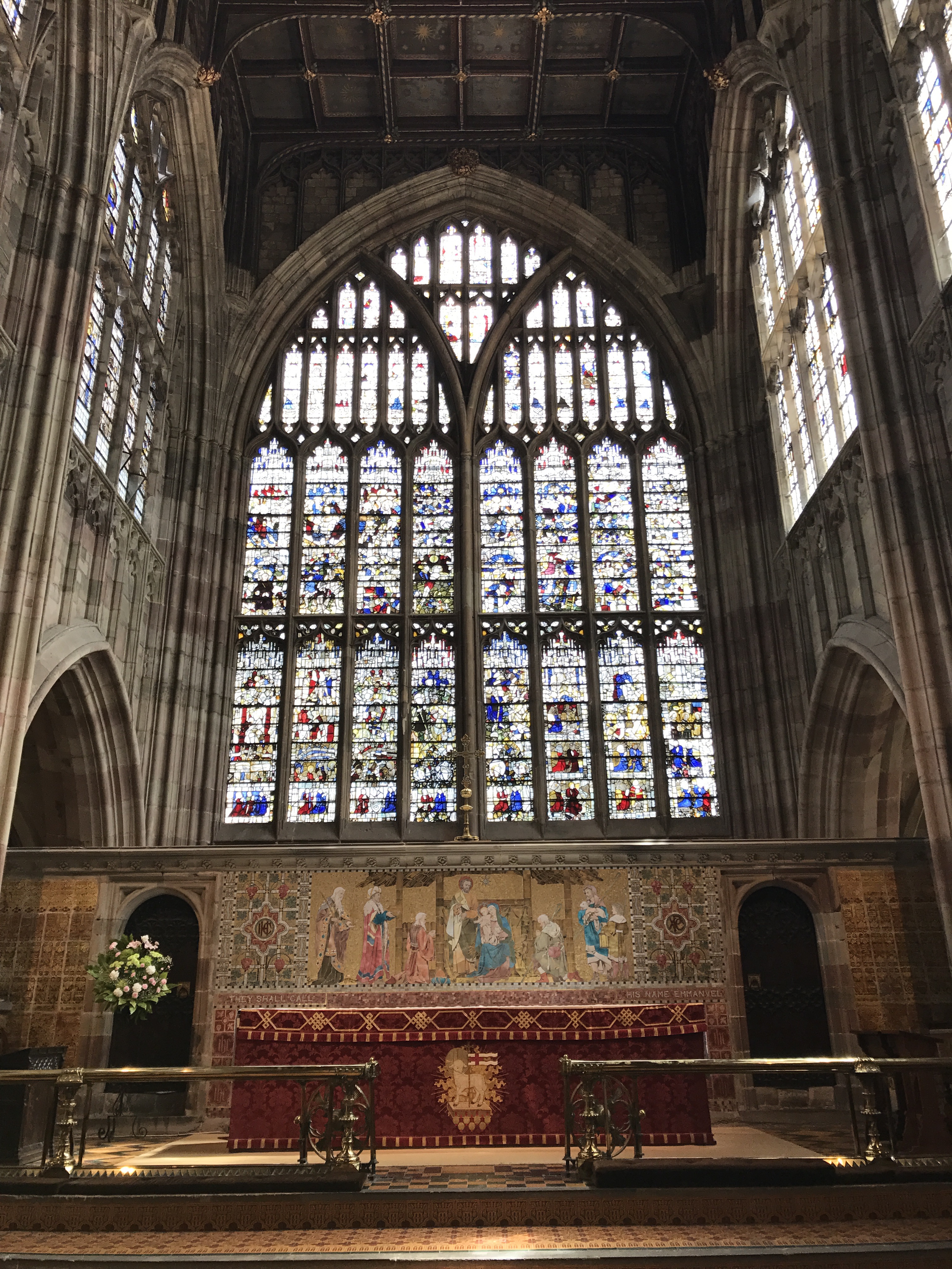 The reredos mosaic behind the altar shows the adoration of the Shepherds and Magi at Jesus’ birth. Made of glass, it was created in 1884 by James Powell & Sons. The East window is the largest in any parish church in England. It is connected to the great early fifteenth century stained glass painter John Thornton of Coventry and was created in around 1430. In the eighteenth century it was damaged by a large tree of ivy and so some parts of it are now a kaleidoscope of medieval fragments. It originally displayed scenes from the Passion, death and resurrection of Jesus and some of those panels can still be seen in the middle left of the window.