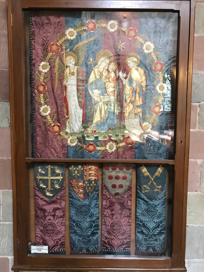 In the south wall (above) is a blocked up Norman doorway. The door once led into the cloisters of the monastery. It currently displays a sublime banner designed by Comper