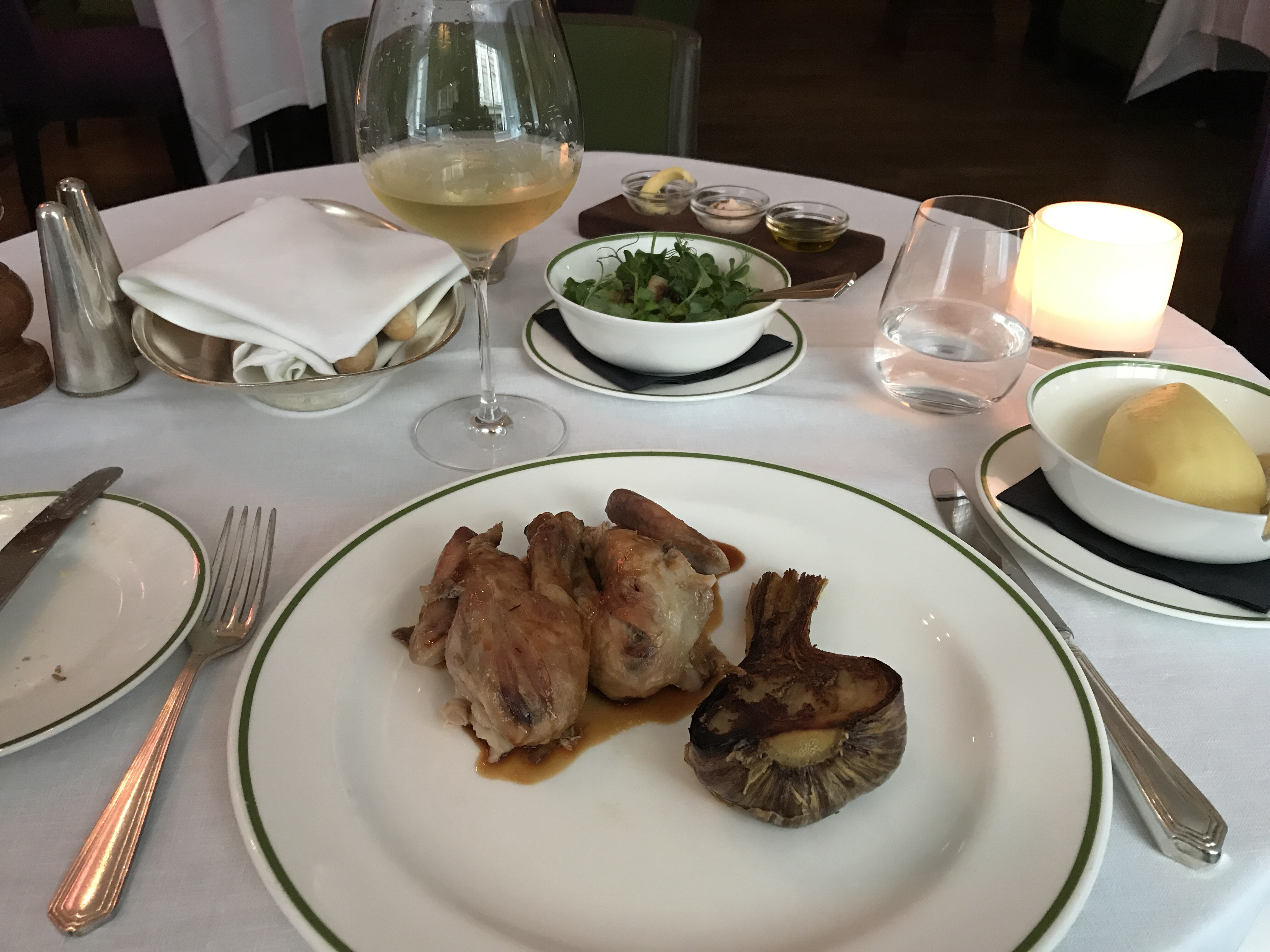 The small whole chicken was smoked, and was carved at the table. Unfortunately the parsnip had garlic in it (which I am avoiding) but it looked great.
