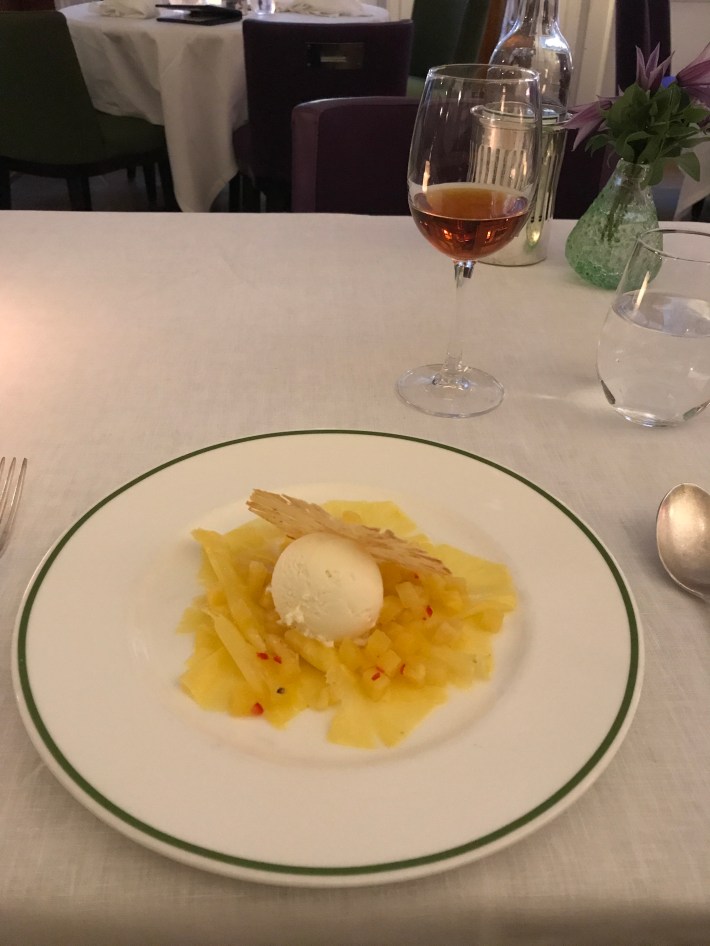 Just got back in time for dessert – thinly sliced pineapple with chilli & ice cream and a 1999 Tokaji from Hungary.