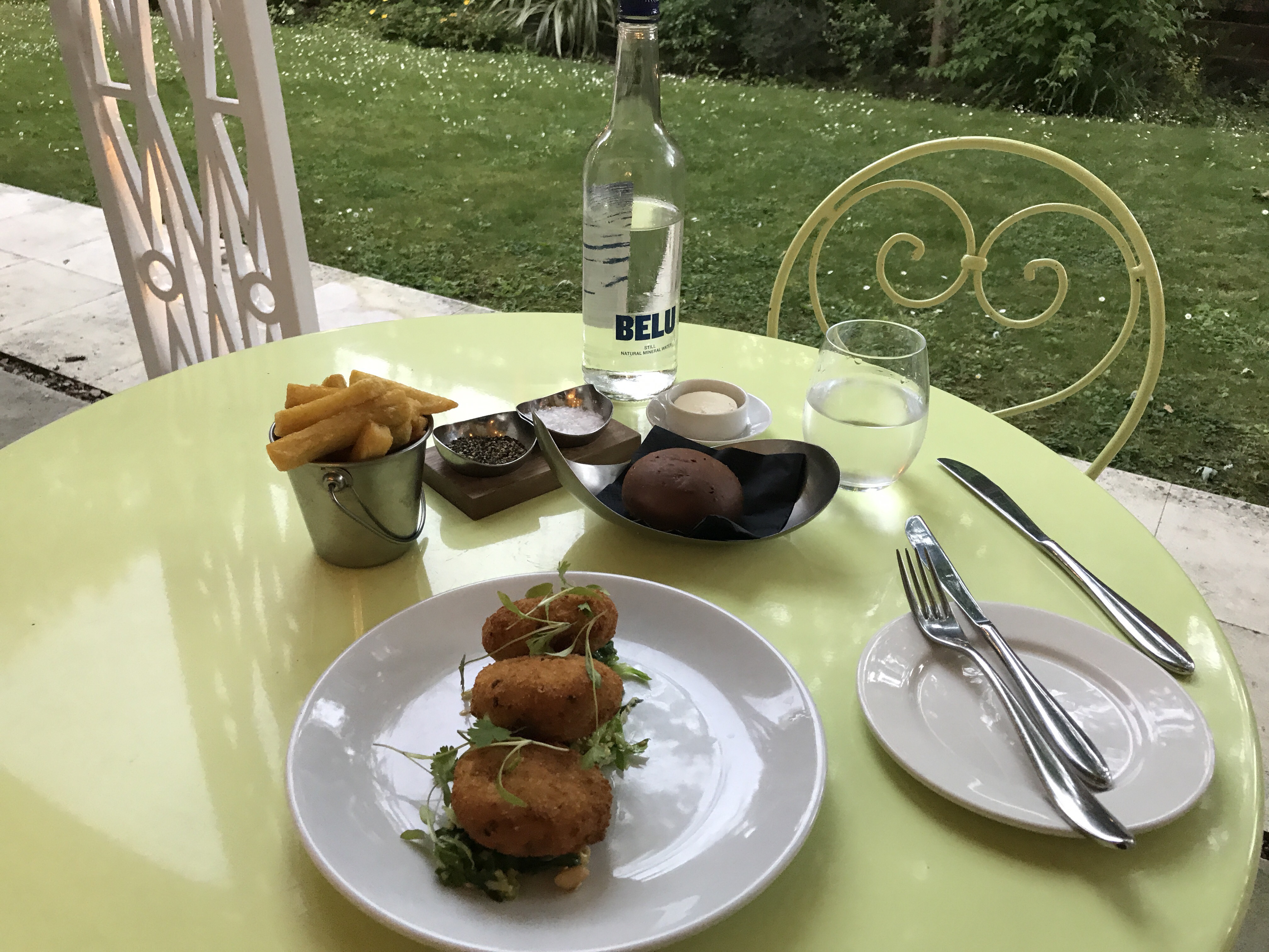 Dinner was served on the terrace in the balmy early evening. It could have been Savannah, but it is Exeter.