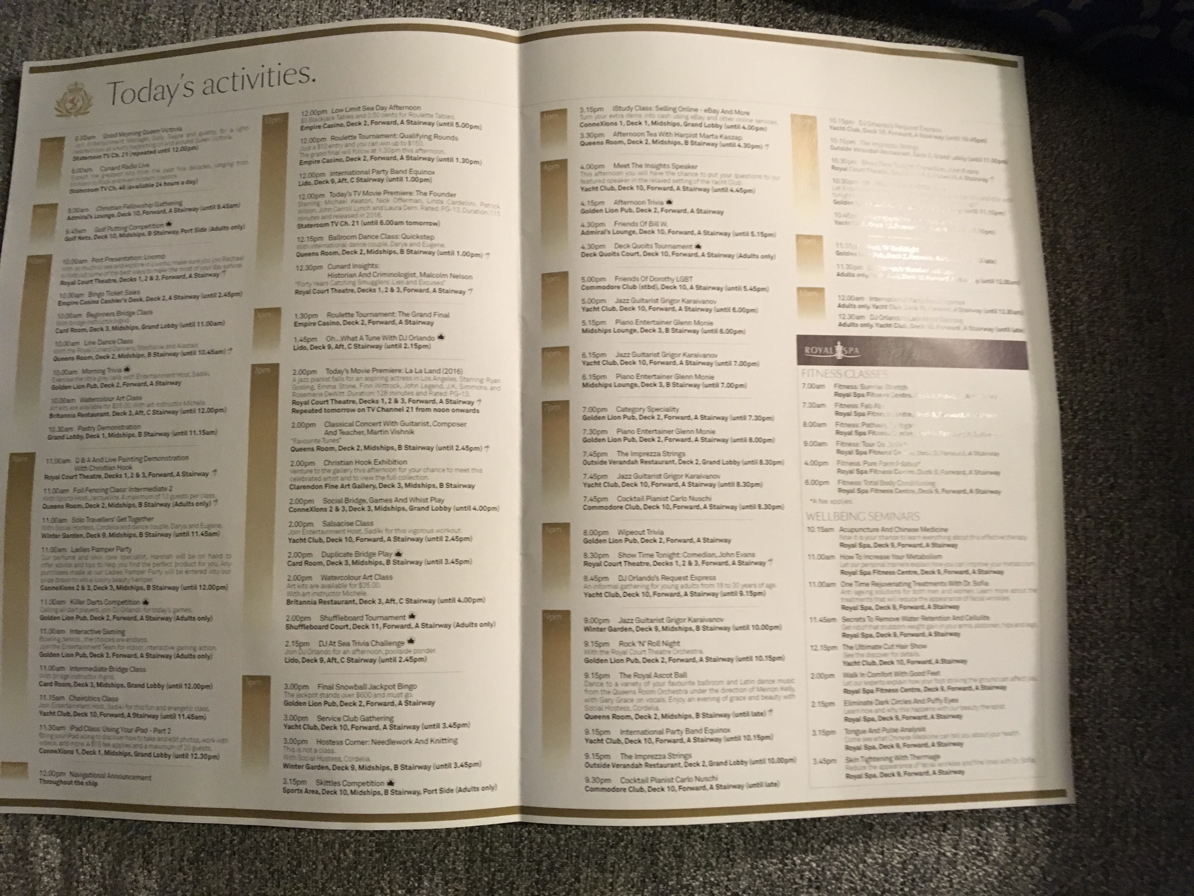 There are heaps of things to do every day. The schedule is delivered the previous evening.