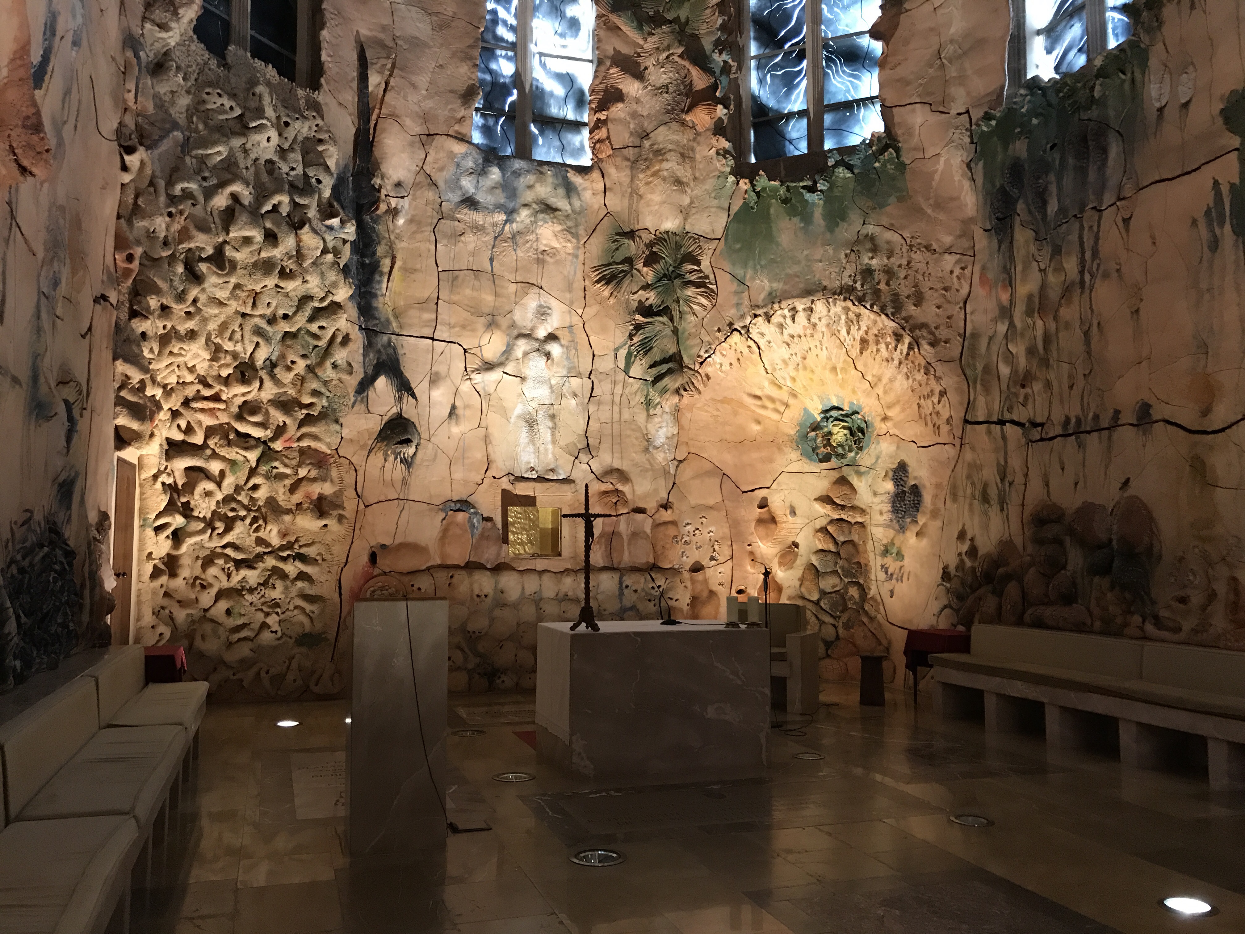 “Cracked ceramic covers the chapel’s walls creating a cavelike feel while sculpted fish, bread, fruit, and human skulls feature prominently in the panoramic relief. The chapel’s stone furniture and darkened stained glass windows complete the scene’s dramatic effect.”