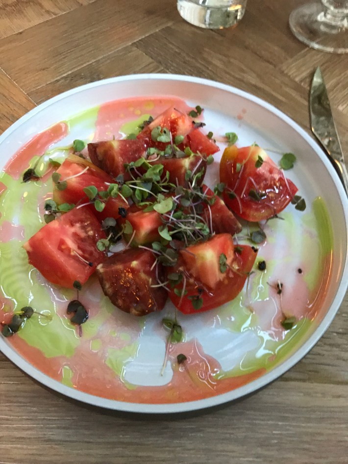This was followed by ‘seasonal tomatos, fermented strawberrie juice, basil’. Notice the rich colour of some of those tomatoes. There seemed a lot, but they disappeared in a second. (Yes, I eat vegetables when they are served like this).