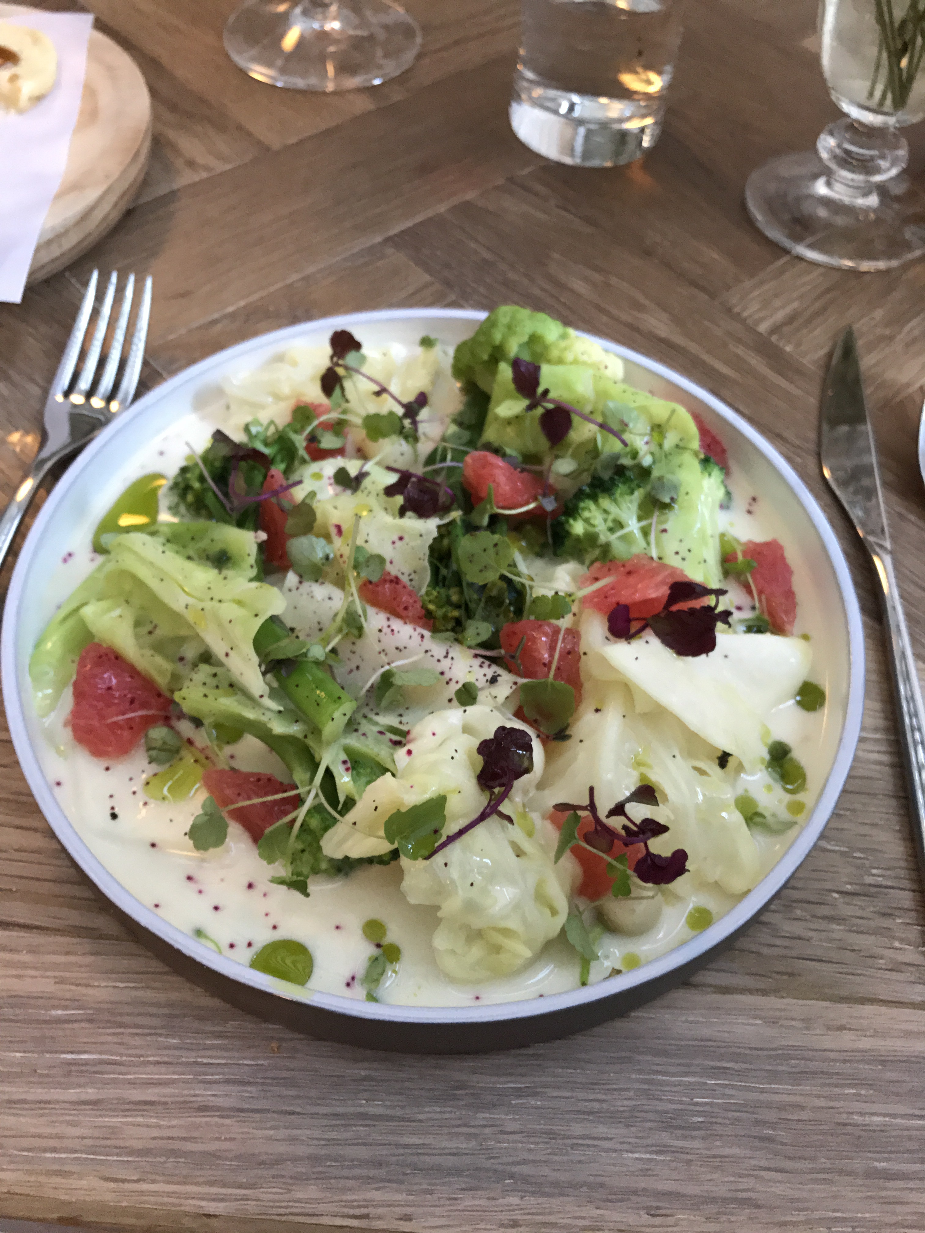 Next was ‘Brassicas, grapefruit, mussel emulsion aromátics’. Brassica is a stemmed vegetable, from the mustard family. There was a spoon for the sauce, and I used it.