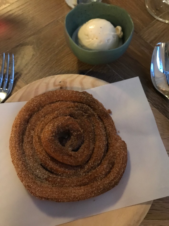 ‘Churros, tonka bean ice cream’. Piped thin, melted in the mouth. Perfect.