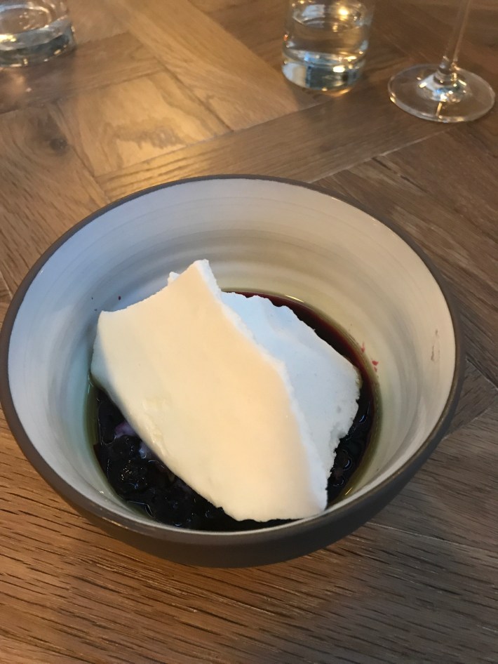 Styled ‘Sheep’s milk, blueberries, pumpkin seed oil’. With meringue boards as a covering. How good can a dessert be? Very good.
