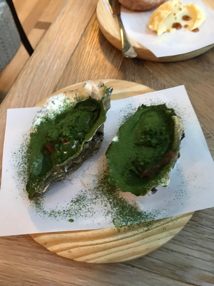 For appetiser – ‘Oyster Krystal, grapefruit, samphire’. Thank is pink grapefruit under the samphire dusting. Totally delicious.