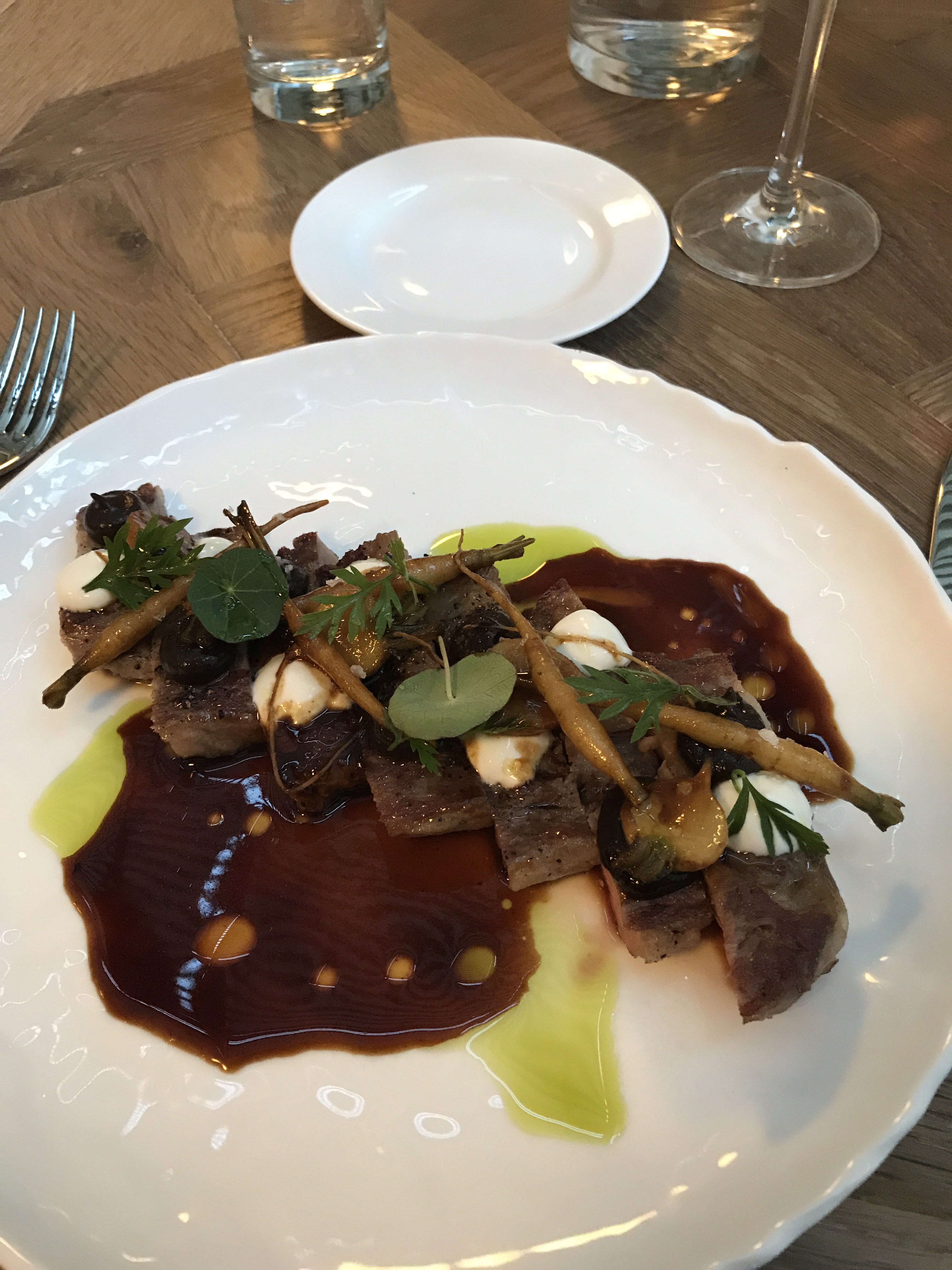 The baby turnips make a comeback. A main course of ‘Iberian pig “Pluma”, black garlic, crême fraiche, turnip’. Perfectly moist.