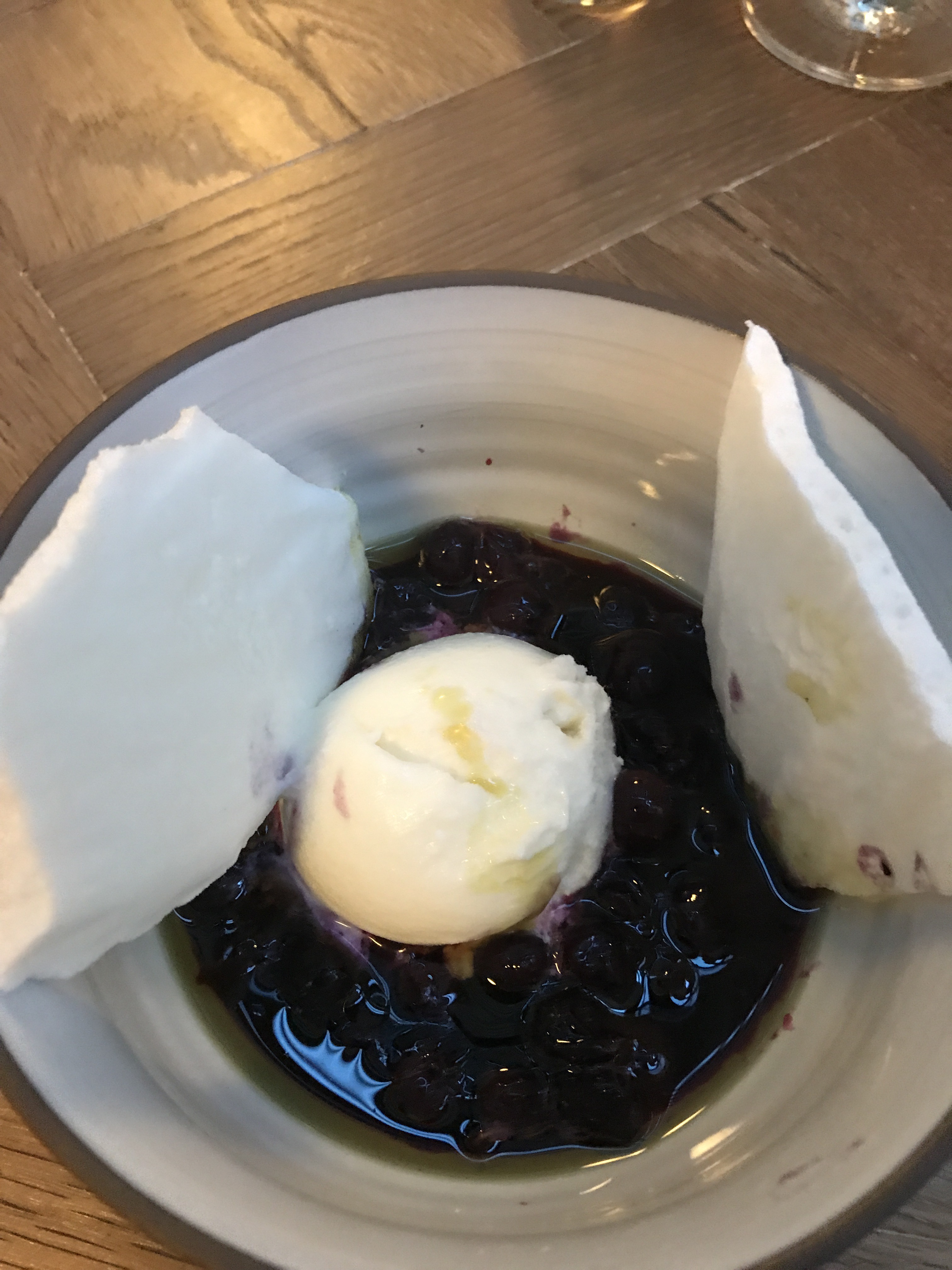 For dessert, ‘Sheep’s milk, blueberries, pumpkin seed oil’.