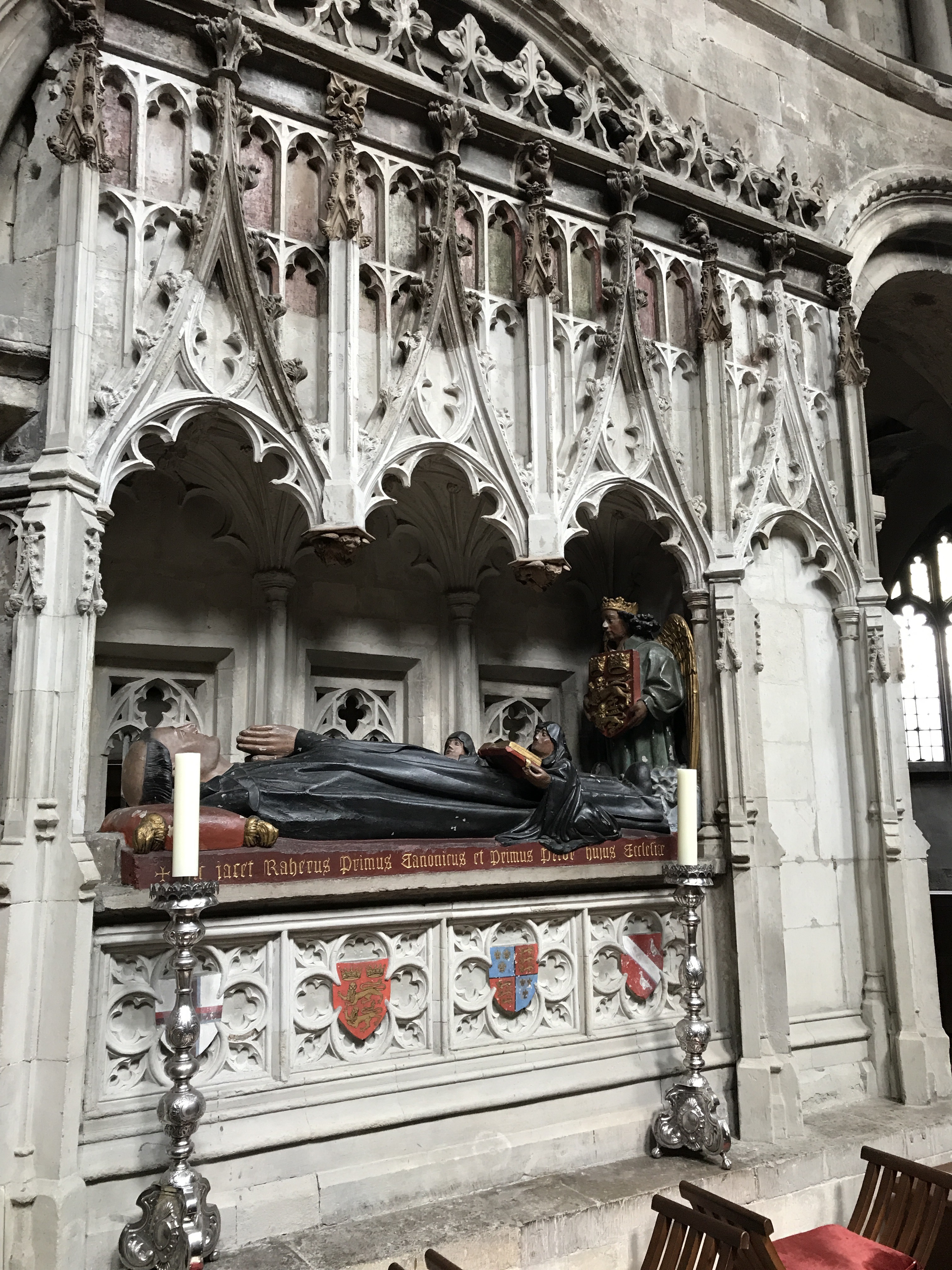 The founder of the church, hospital and Priory, Prior Rahere, was a courtier to King Henry I. He died in 1143. This tomb dates from 1405 and shows him dressed as an Augustinian canon. The angel carries a shield with the arms of the Priory – the lions of Normandy surmounted by two crowns.