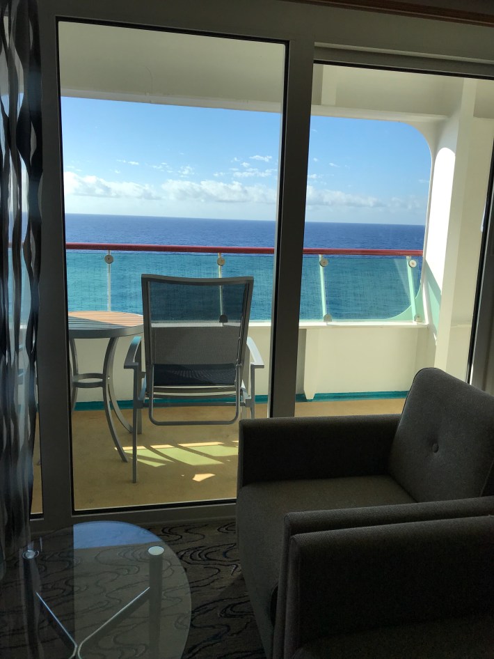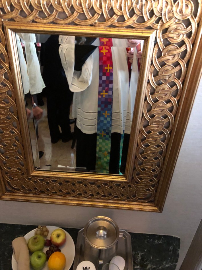 Thirty of us, friends and family, are on the cruise to celebrate a wedding . A glimpse of me at a private service can be seen reflected below.