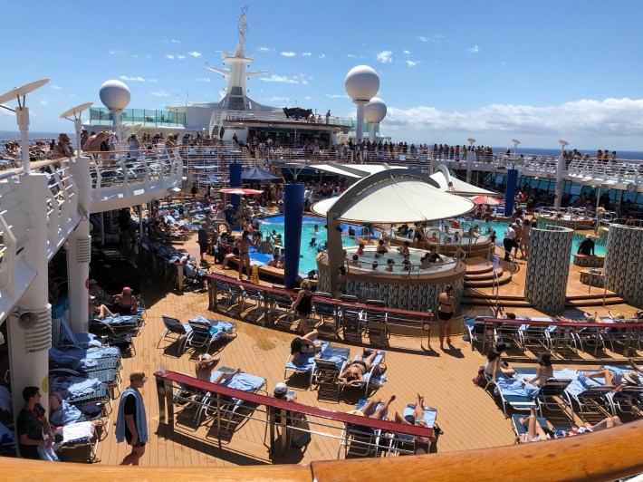 Two days at sea off the coast somewhere out from Port Macquarie. There are 3,900 people on board plus at least 1,000 crew. A three-day cruise brings out all the yobs – present company excepted.
