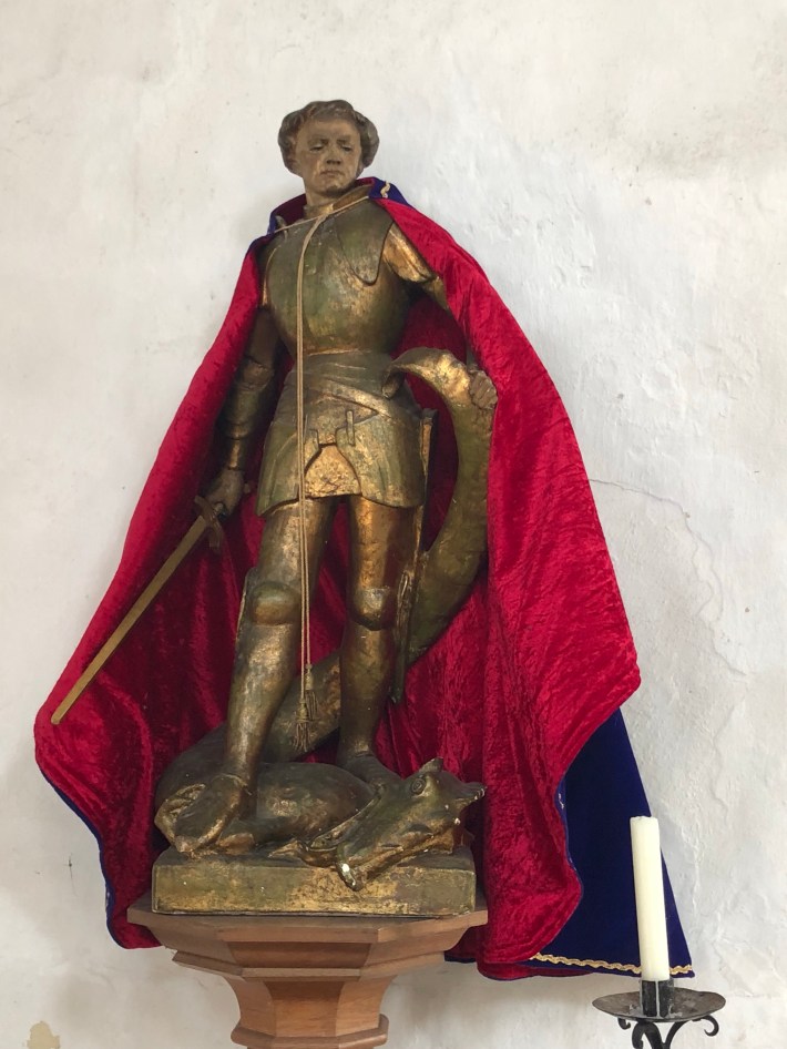 St Charles, King and Martyr, whose reign preceded the Commonwealth, whose churchmanship I admire despite the person of the King, remains with head and crown intact, as does St George (below), who facial expression suggest the dead dragon is a bit ‘on the nose’.
