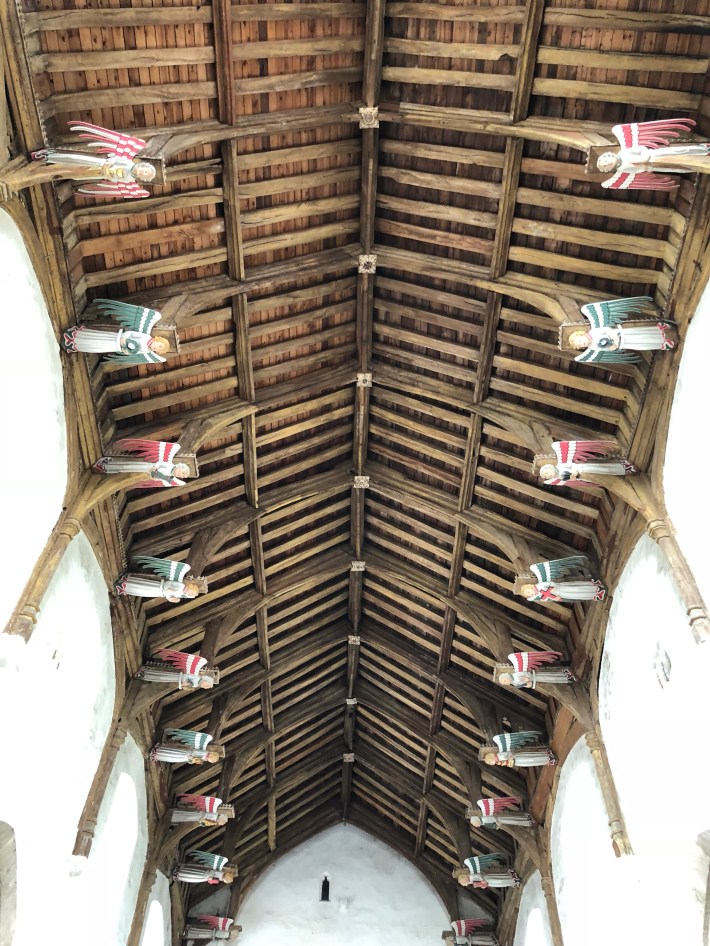 The angels on the ceiling beams were installed after the Battle of Agincourt (1416). During the Civil War (1642-51), the Roundhead soldiers couldn’t get to the angels on the roof so they fired their muskets at them. Fortunately these large figures were refurbished in the 1950s.
