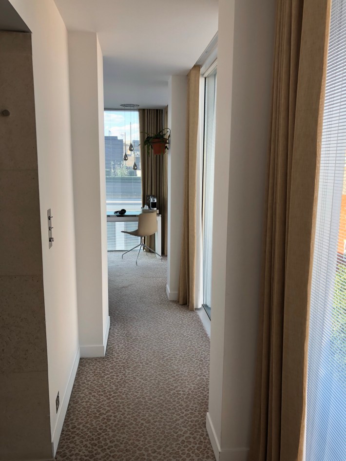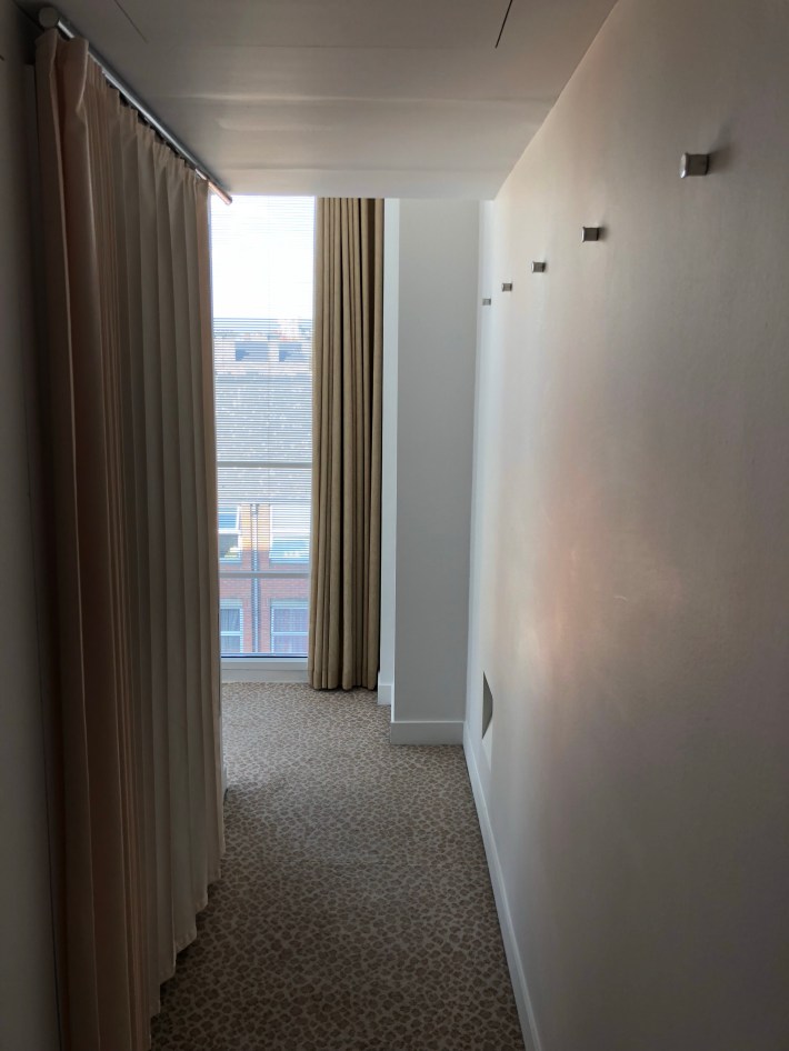 and is on a corner, giving me an internal hallway encased with floor-to-ceiling windows. (There are curtains to avoid voyeurism, if desired).
