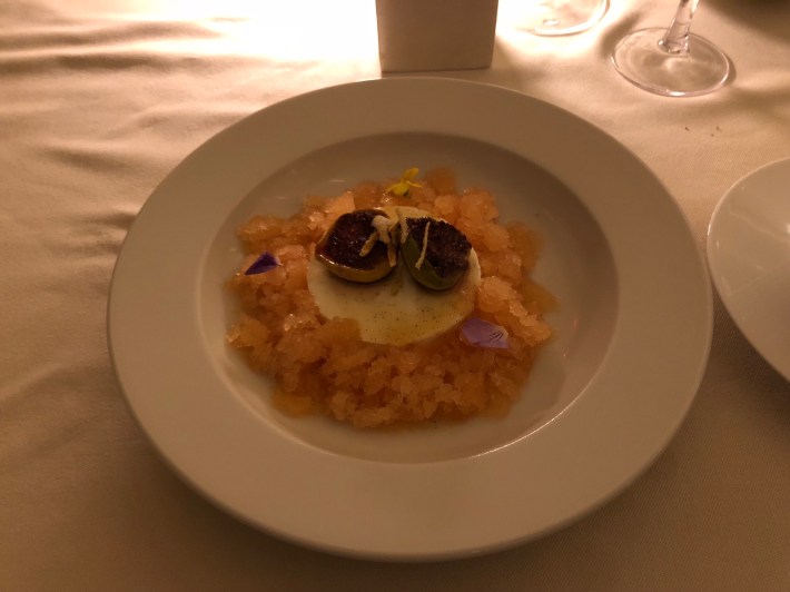 In lieu. I chose Panna Cotta with caramelised figs (which I left in case that was too dangerous after the oysters) and orange Sauvignon Blanc granita.