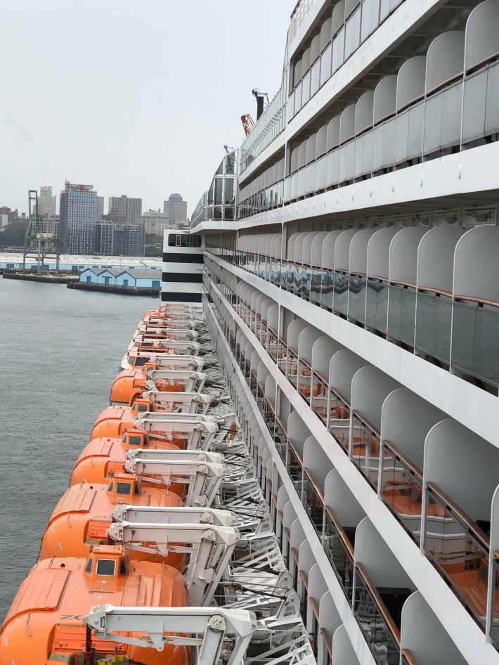 It had rained overnight and remained slightly drizzly as I took leave of Manhattan and headed to the Brooklyn Cruise Terminal to board the Queen Mary 2. I have been advised that I am not on a cruise. I’m on an ocean liner crossing the Atlantic.