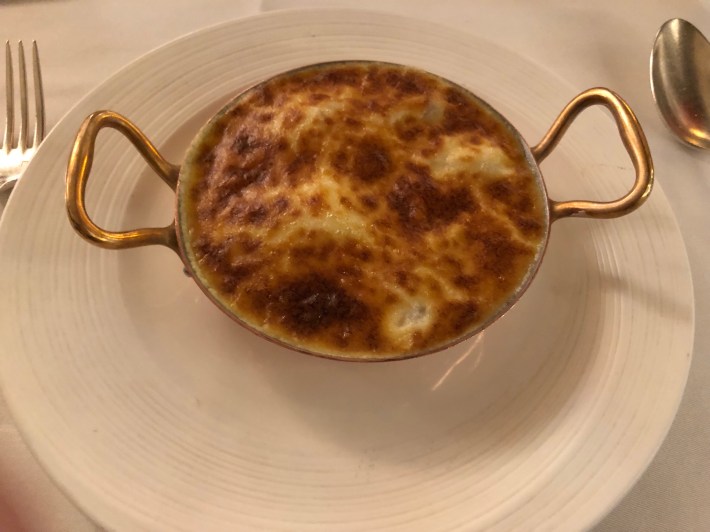 For appetiser I began with the Glazed omelette ‘Arnold Bennett’, a base of scrambled eggs, various cheeses and grated potato with a béchamel and hollandaise sauce canopy. Delicious but in appearance