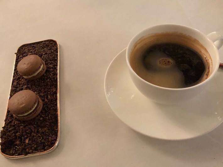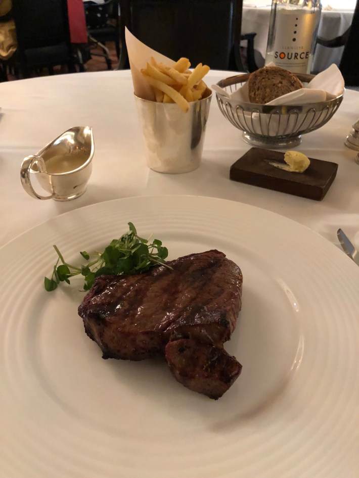 For main course I chose a rump steak with ‘skinny chips’ accompanied by a glass of ‘Candace Nero de Troia, Cantina Diome1de Puglia, Italy 2013′ translated for me by the sommelier as “A strong red from Southern Italy’ and chosen by me because it has the word ‘pug’ in its title.