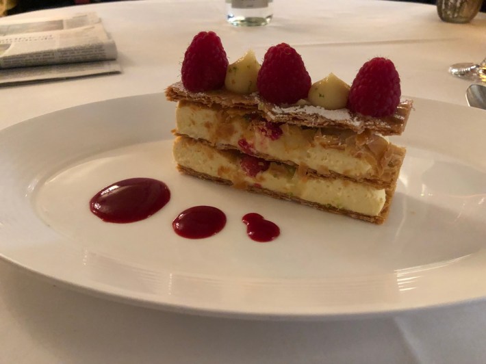 For dessert, a Mille Feuille, soft, delicious and with raspberries.