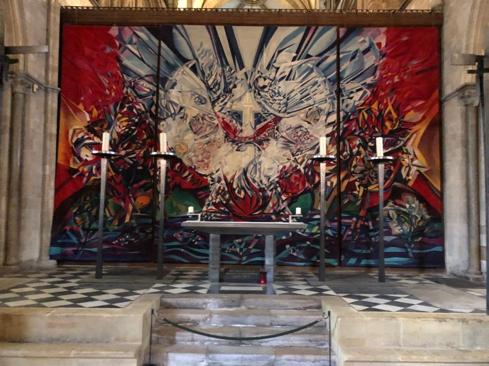 The quire and high altar has another tapestry as its reredos – a seven panelled tapestry designed by John Piper representing the Holy Trinity in the centre of its creation. It was dedicated in 1961.