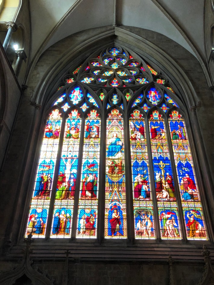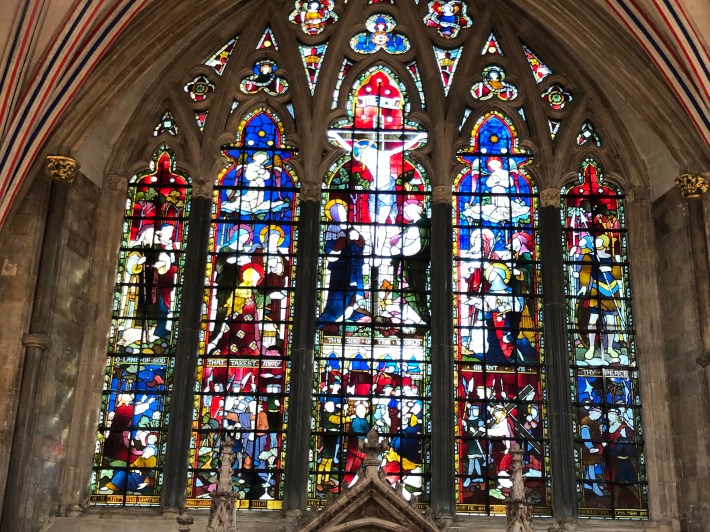 It is adjacent to a stained glass window designed by Marc Chagall and installed in 1978. It is based on the text of Psalm 150: “O praise God in his holiness – let everything that has breath praise him”. Not really to my taste but there were plenty of fine other windows.