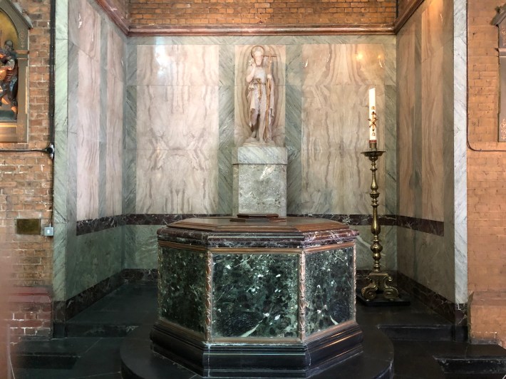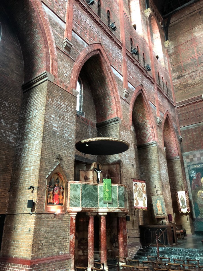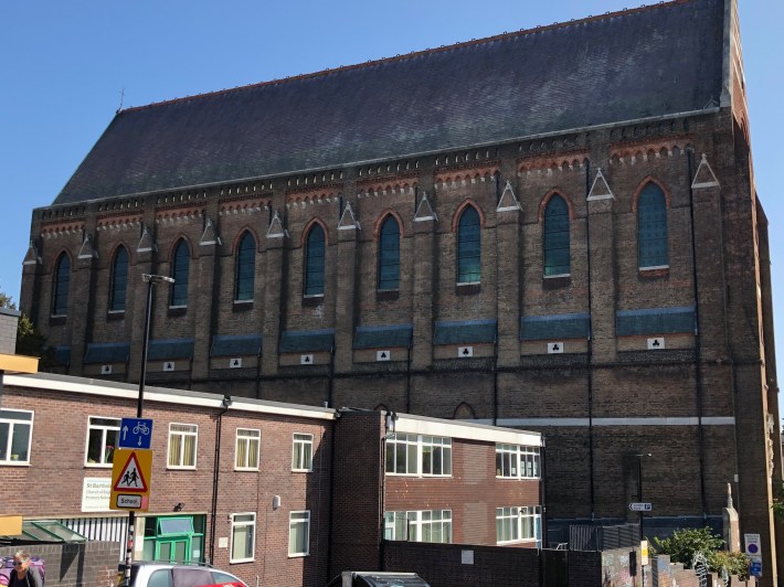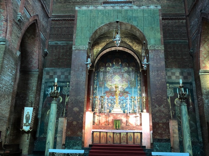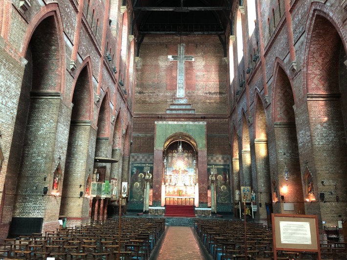 It is as foreboding inside and out, with brick walls towering some six stories above the congregation.