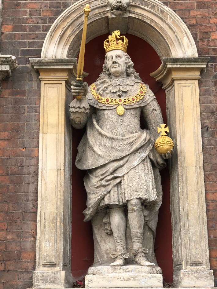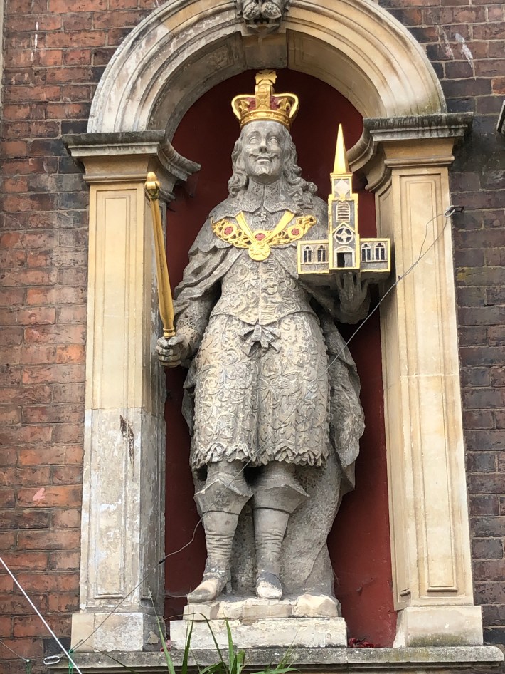 Indeed there are reminders of the Carolinians (installed after the Restoration, of course, both on the Guildhall in the Main Street (below) and in the Cathedral.