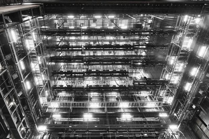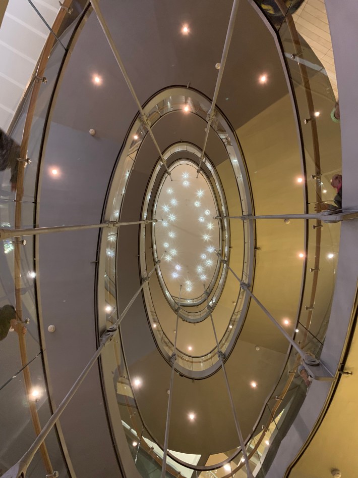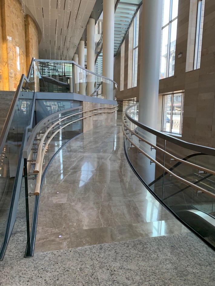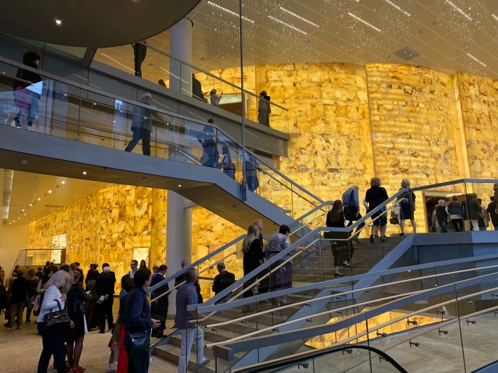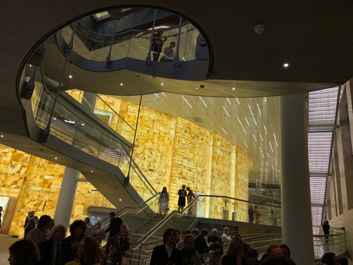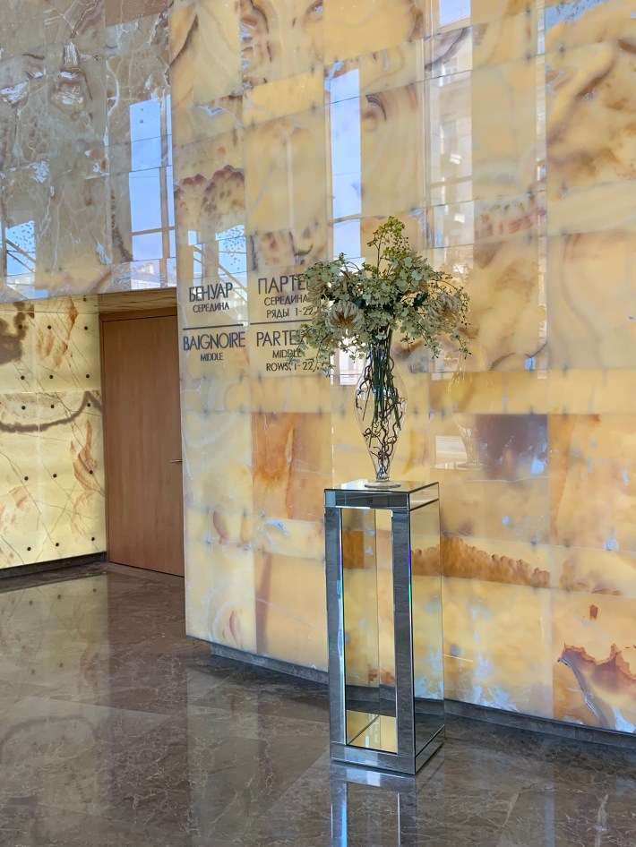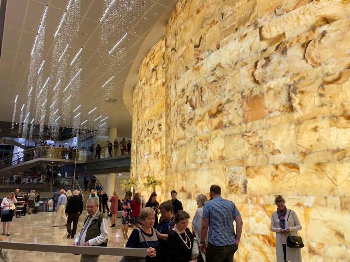 The use of 5mm thick square sheets of back-lit alabaster certainly gives the foyers an aura.