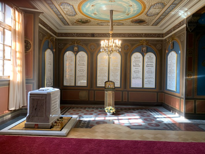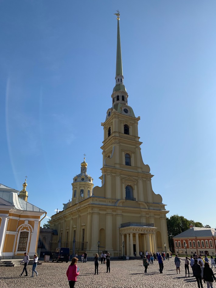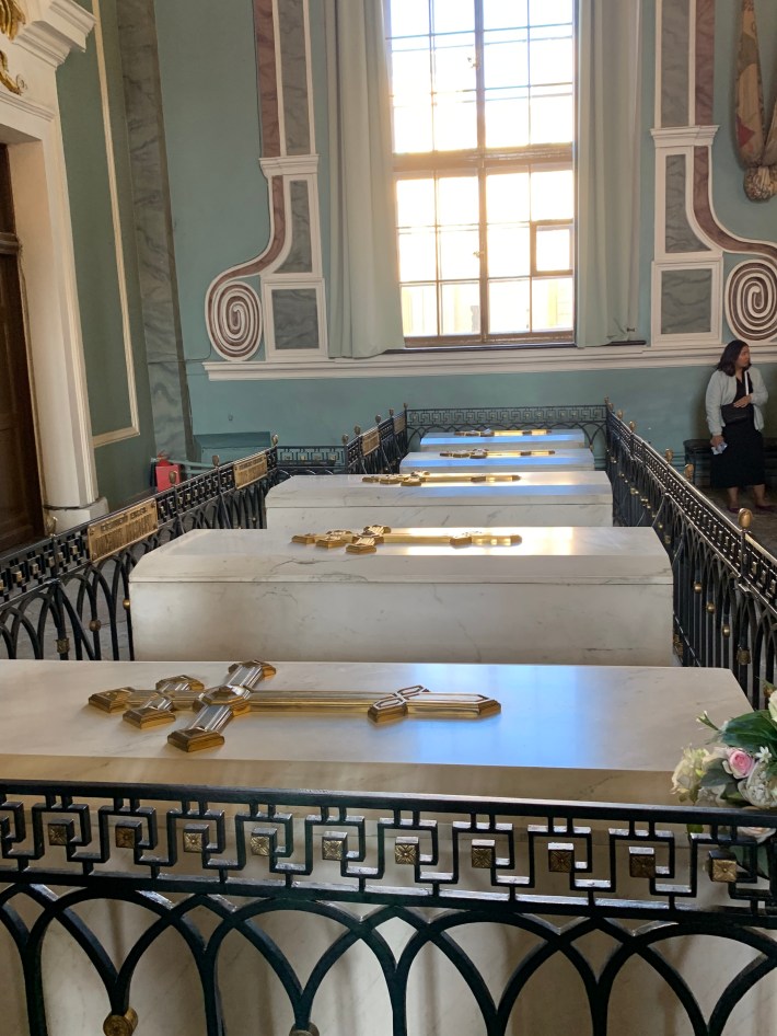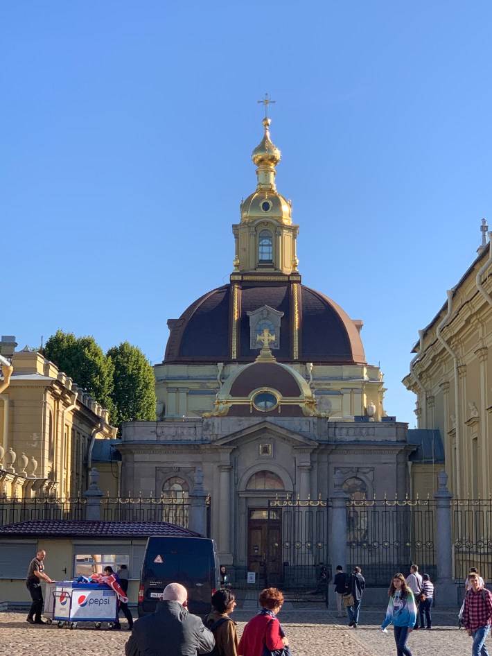 The Cathedral of St Peter and St Paul in St Petersburg is the final resting place for most of the Romanov Tzars. A little gilt on the outside but a lot on the inside.