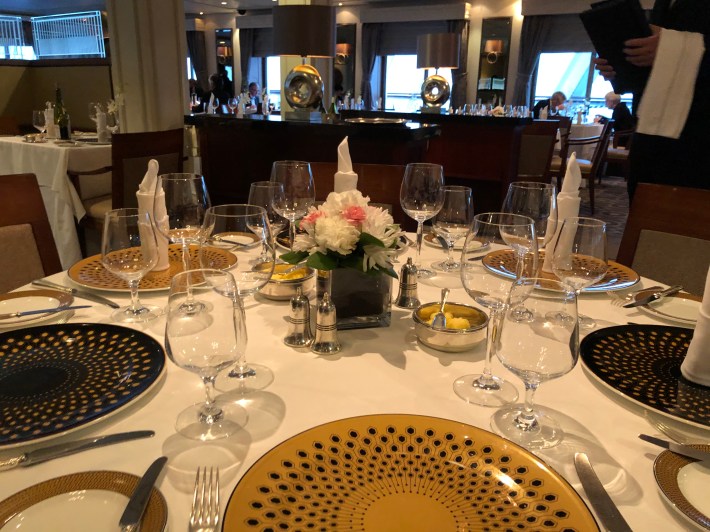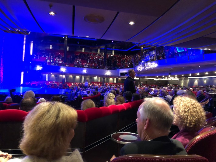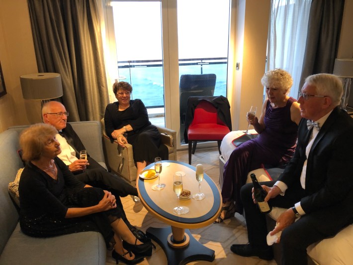 Another birthday this evening, this time for David. He and Shirley (seared on the bed) invited all our table to pre-dinner drinks in their stateroom.