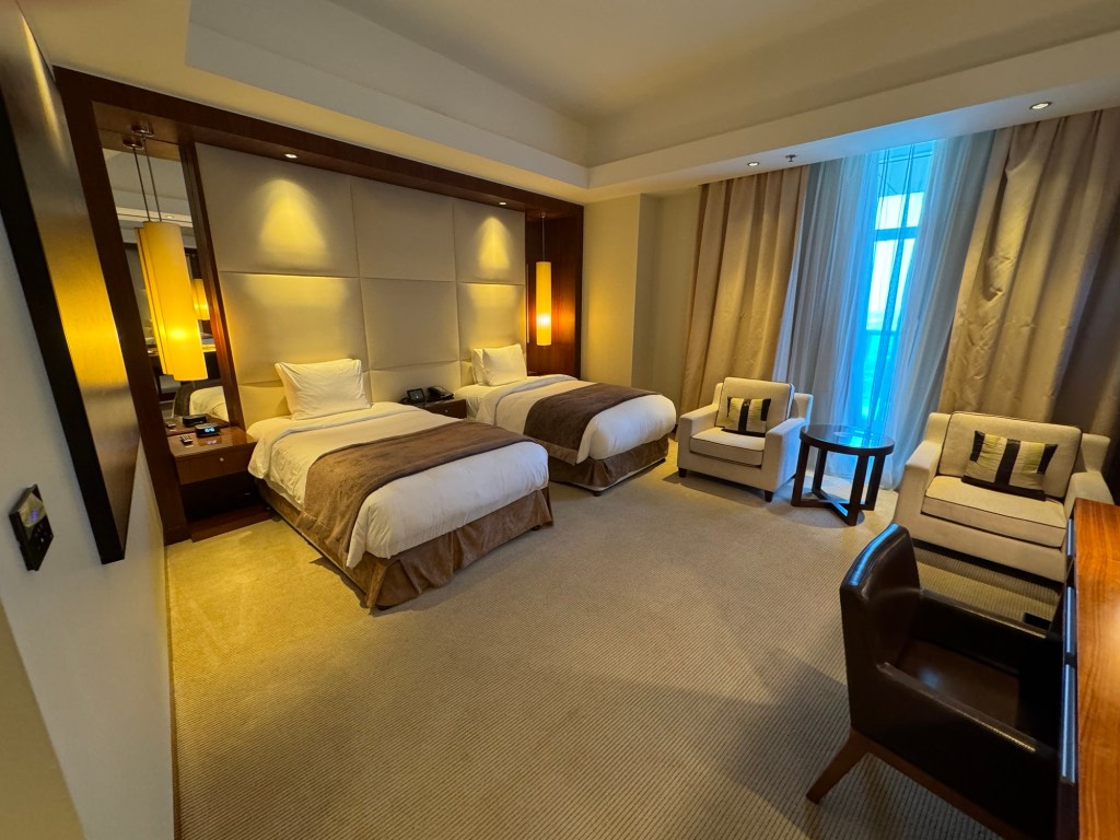 But I did take photos of my suite – makes a nonsense of not being able to use their business lounge. The Marriott have a reception desk dedicated to Emirates orphans, so it was a very polished check-in. They clearly have the deal with Emirates for business class orphans – in the lower floors of 2 seventy-storey towers.