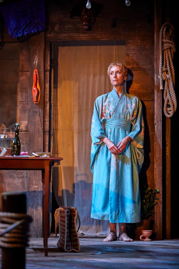 The iguana makes a brief appearance as it is carried across the stages bundled in sacking and taken below where it can occasionally be heard thrashing around seeking release, much like the human characters. The parallel between the captive iguana, tied by the throat and craving freedom, and Hannah’s dying grandfather is also remorselessly spelt out.