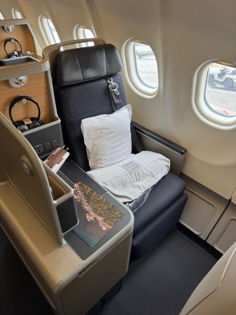 Whilst we are on the subject of nappery, and while I do like a proper napkin, Qantas need todo something about lint. I started off quite neat (above), but after the dinner service I looked like a blue lamington. I’m still picking off the fluff of my shirt some 6 hours later.