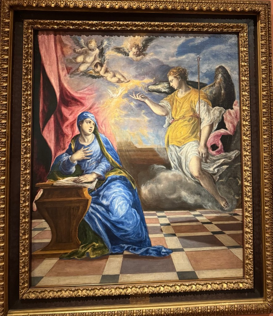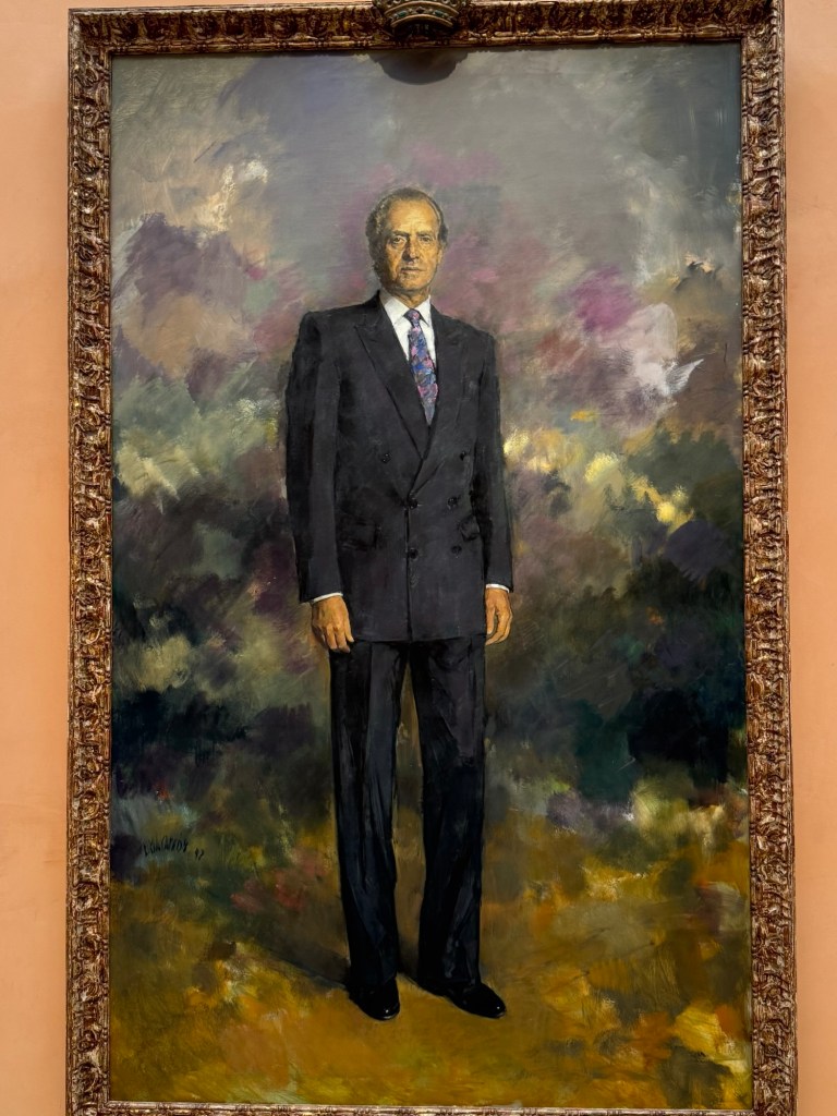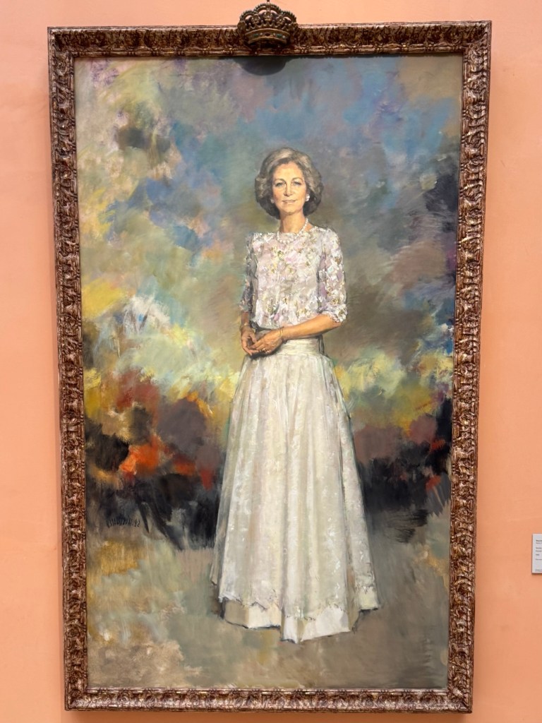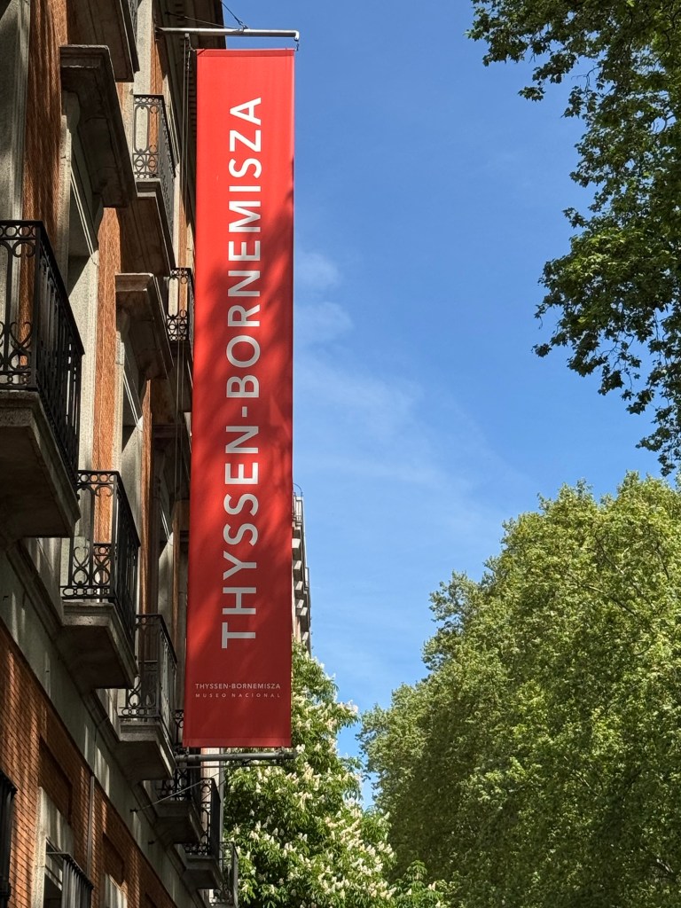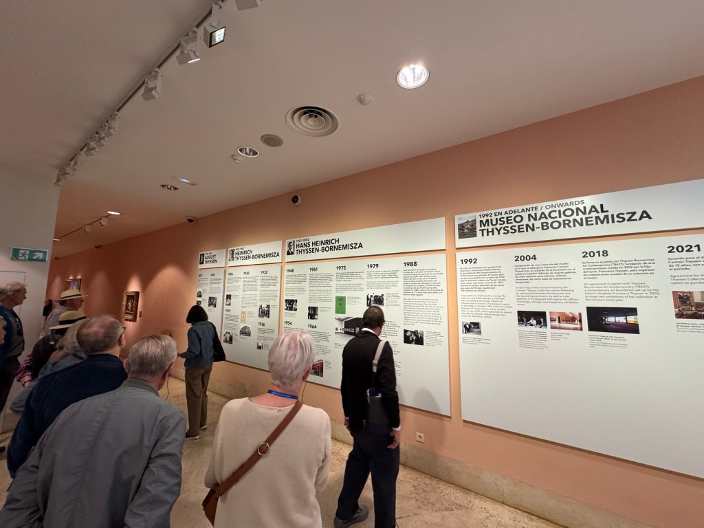 entranceKing Juan Carlos I At time of opening of the galleryQueen Sofia at the opening of the galleryBaron Thyssen-BornemiszaBaroness Thyssen-BornemiszaAnon, The Virgin Annunciate, 1360-80Gerard David, The Crucifixion, 1475Master of the Magdalen Legend, Man as St Andrew, 1480Bramantino, The Risen Christ, 1490Hans Memling, Portrait of a Young Man praying, 1490Hans Holborn, Henry VIII, 1537Domenico Ghirlandaio, Giovanna degli Albizza Tournabouni, 1489-90Gentile Bellini, The Annunciation, 1475Bronzino, Portrait of a Young Man as St Sebastian, 1533Vittore Carpaccio, Portrait of a Knight in a Landscape, 1505Hans Burgkmair, Christ’s body is carried to the Tomb, 1520Alberto Durero, Jesus among the Doctors, 1506Hand Baldung Gruen, Adam and Eve, 1531El Greco , The Annunciation, 1576Claudio de Laurena, Pastoral Landscape with the Flight to Egypt, 1663Zurbarán, Christ on the Cross, 1630Francesco Guardi, The Grand Canal with San Simeone Piccolo and San Lucia, 1780Canaletto, The Grand Canal from San Vito, Venice 1723-4Canaletto, The Piazza San Marco in Venice, 1723-4Van Goyen, A river estuary with ‘smalschips’, fishermen, and cattle watering, 1651 Van Goyen, Winter landscape with figures on the ice, 1643Peeter Neeffs I, Interior of a Gothic Church, 1615-6Gerrit Dou, A young woman with a candle at the window, 1558-65Edgar Degas, Swaying Ballerina (Dancer in Green), 1877-9Camille Pissarro, Rue Saint Honoré in the afternoon, Effect of Rain, 1897Edward Munch, Bay with boat and house, 1881Édouard Manet, Horsewoman- full face (L’Amazone), 1882André Derain, Waterloo Bridge, 1906Elon Schiele, Houses on the river (the old town), 1914Vincent Van Gough, Les Vessenots in Auvers, 1890Emile Nolde, Autumn Evening, 1924Ernst Ludwig Kirshner, Fränzi in front of curved chair, 1910Franz Marc, The Dream, 1912Lyonel Feininger, Architecture II (the man from Putin), 1921Wasilly Kandinsky, Murnau, top of the Johannisstrausse, 1908Emile Nolde, Glowing Sunflowers, 1936František Kupka, Study for the Language of Verticals, 1911Wasilly Kandinsky, Picture with three spots No. 196, 1914Max Weber, Grand Central Terminal, 1915Marc Chagall, TheMadonna of the Village, 1938-42Joan Miro, Catalan peasant with guitar, 1924Salvatore Dali, Dreamcaused by flight of a bee around a pomegranate, a second before waking up, 1944Salvatore Dali, Gravida rediscovers the anthropomorphic ruins, 1932Paublo Picasso, Bullfight, 1934Balthus, The Card Game, 1948-50Christian Schad, Portrait of Dr Haustein, 1938Otto Dix, Hugo Eufurth with dog, 1936Edward Hopper, HotelRoom, 1931Andrew Wyeth, My Young Friend, 1070Jackson Pollack, Brown and Silver I, 1951Georgia O’Keeffe, Abstraction. Blind I, 1921Mark Rothco, Untitled. (Green on maroon), 1961Robert Rauschenberg, Express, 1963Lucien Freud, Maninchair (Baron H H Thyssen-Bornemisza, 1985Frank Auerbach, Head of of JYM, 1978Francis Bacon, Portrait of George Dyerin a mirror, 1968Lucian Freud, Reflection with two children (self portrait) 1965Alberto Giacometti, The Glade, 1950Alberto Giacometti , Portrait of a woman (Rita?) , 1965 Nicholas de Staël Grey composition, 1948, Karel Appel, Wild Horses, 19574Frank Auerbach, The Shell Building site from the Thames, 1957Ben Shahn, Carnival, 1957Bertrand Mendel, Lucky Dragon, 2009Richard Lindner, Moon over Alabama, 1963Roy Lichtenstein, Woman in Bath, 1963David Hockney, In memorandum of Cecchino Bracci, 1962László Moholy-Nagy, Circle segments, 1921Irma Álvarez_Laviada, Sampler I, 2000Irma Álvarez_Laviade, Too Pink for a Merzbilt (installation) 2026Irma Álvarez_Laviada, Sampler II, 2000Exhibition
