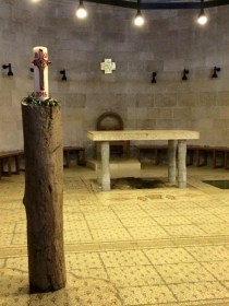 In St John’s Gospel it is at the feeding of the 5,000 that Jesus feeds the crowd in Eucharistic fashion, and we visited the reputed site where is occurred – because someone kindly marked the spot with a basalt stone,