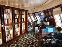 A pleasant but cloudy day at sea so it was breakfast in bed for me. This morning I made a visit to the ship’s library. It is adjacent to the Cunard Shop which sells books and other newsagency-like material. Today,