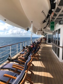 The sun is out today and so were the deck chairs. Two laps of Deck 7 is 1.1kms and three laps is 1.1 miles. I managed one-half, quite adequate. Not overwhelmingly warm but some were in the pools and spas.